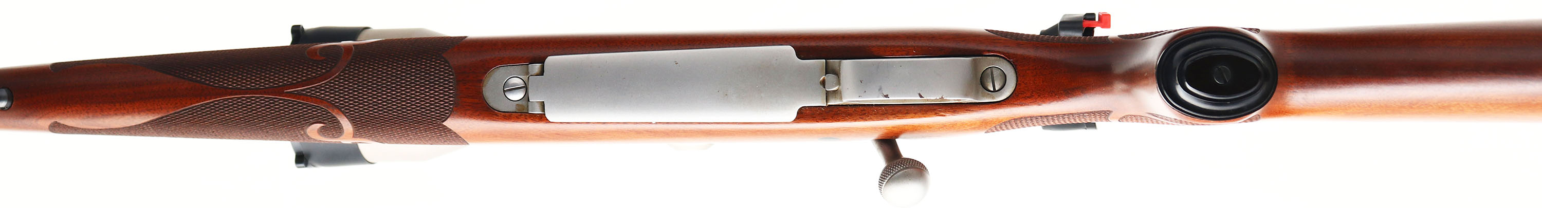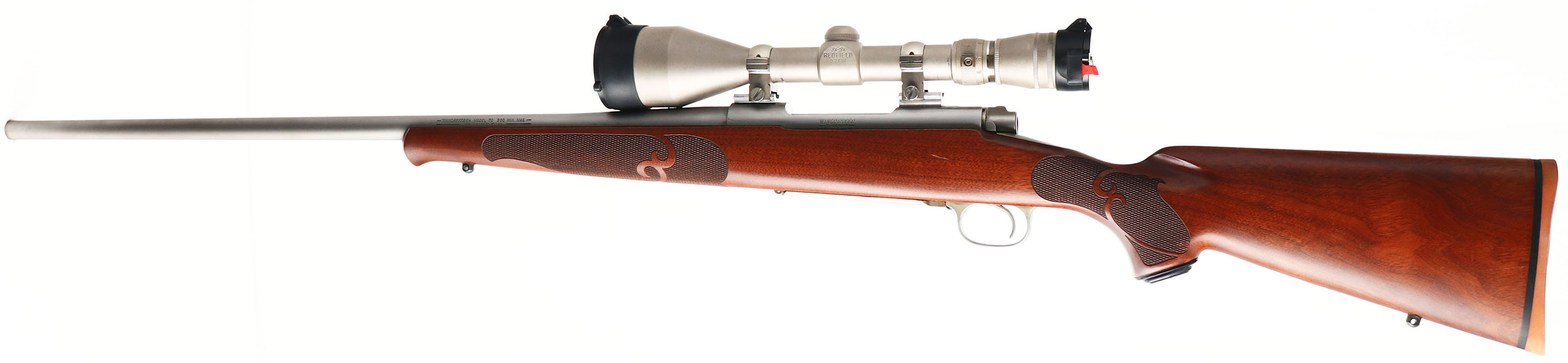 Winchester, Model 70 Classic Stainless, CAL: 300 WIN MAG, MFG: 1993, SN: G43635, Bolt Action Rifle, 24'' tapered round barrel. The factory checkered & flat pistol walnut stock is excellent, with sharp checkering. Stock features a black pistol grip cap & Schnabel forend. There are very few tiny handling marks to the original finish. The stainless metal finish is excellent. Bore is excellent. The rifle is fitted with a Redfield 5 Star 3x-9x scope, while the barrel has no open sight provisions. The buttstock carries a Winchester recoil pad. Sling studs. An overall excellent & original Classic Stainless. FFL Req. - Value: 500 to 1000