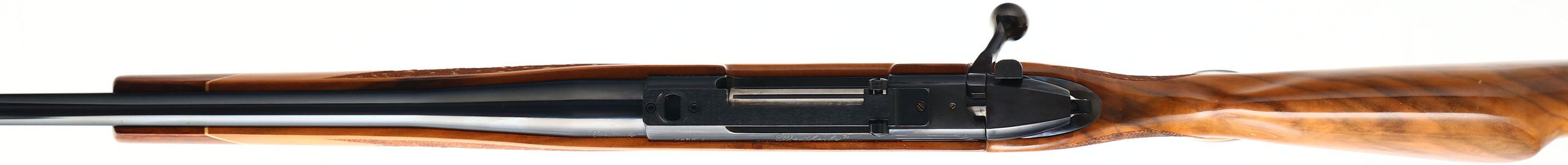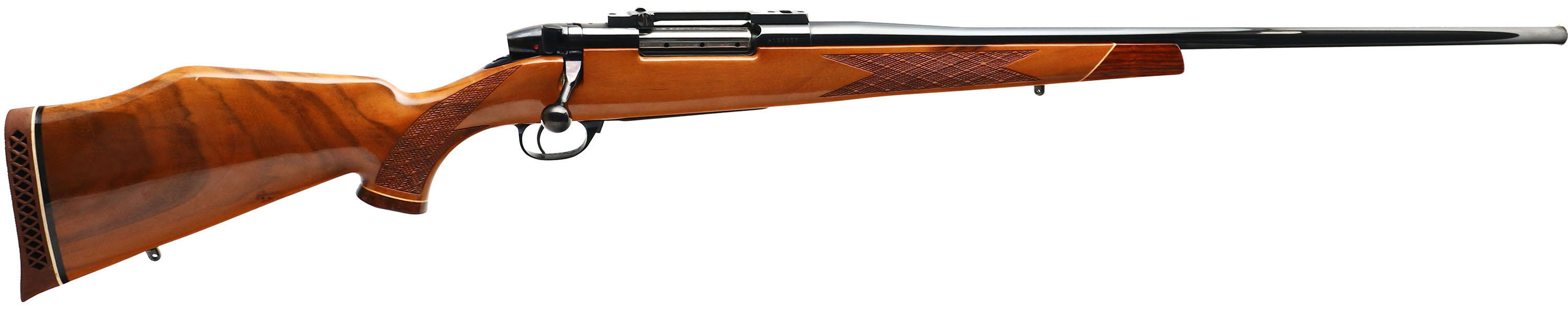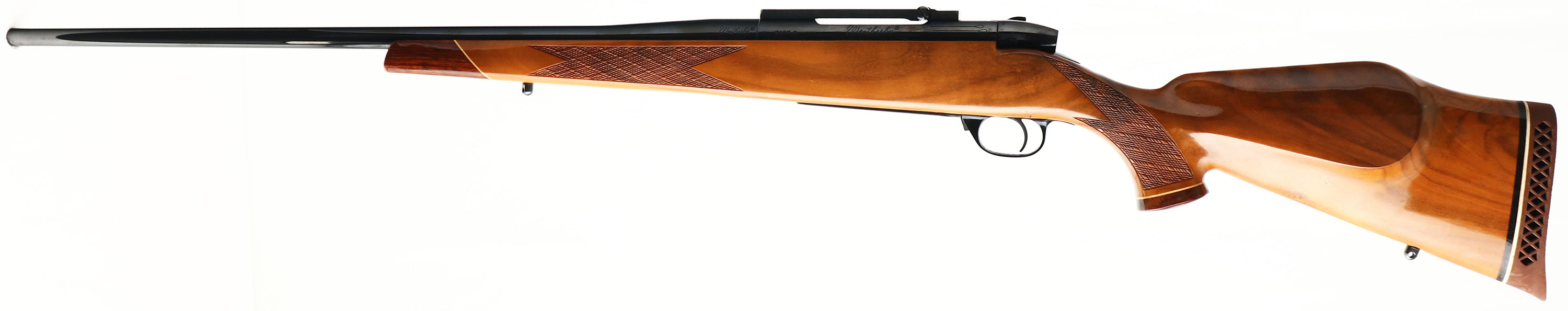 Weatherby, Mark V, CAL: 7mm Magnum, MFG: 1972-94, SN: H138307, Bolt Action Rifle, 26'' barrel. The original checkered, cheeked & flat pistol grip stock, with redwood forend tip & grip cap, is excellent. There are minor storage marks & a couple of tiny dings to the factory high gloss finish. The factory metal blue finish rates 99% overall. Bore is excellent. The receiver holds a Leupold scope base. No open sight provisions. Sling studs. Stock has a Weatherby ventilated recoil pad. A quality hunting rifle. FFL Req. - Value: 700 to 1200