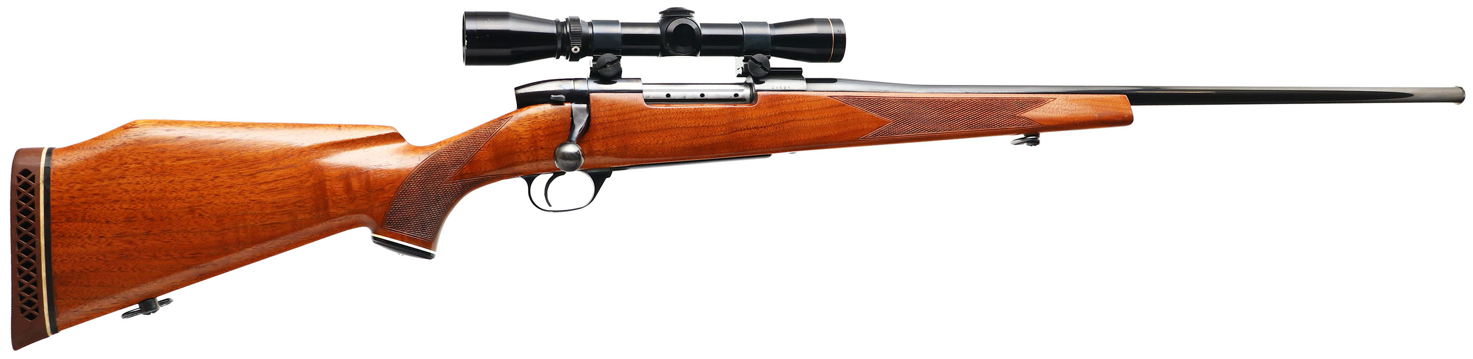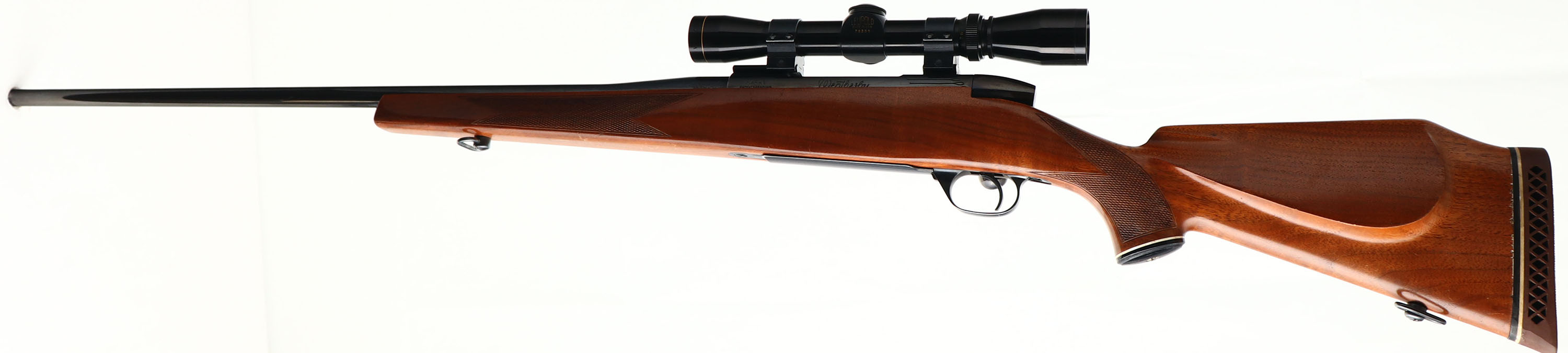 Weatherby, Mark V, CAL: Weatherby 300 Magnum, MFG: 1963-73, SN: 24591, Bolt Action Rifle, 24'' fast tapered barrel. The original checkered, cheeked & capped pistol grip stock is excellent. There are several minor handling marks, finish scrapes & contusions to the e factory finish. The factory metal blue finish rates 97% overall. With the receiver finish starting to tone plum. Bore is excellent. The receiver holds a Leupold VARI-X II 2 scope, with no open sight provisions. Sling loops. Stock carries a Weatherby ventilated recoil pad. A quality hunting rifle. FFL or C&R Req. - Value: 700 to 1200
