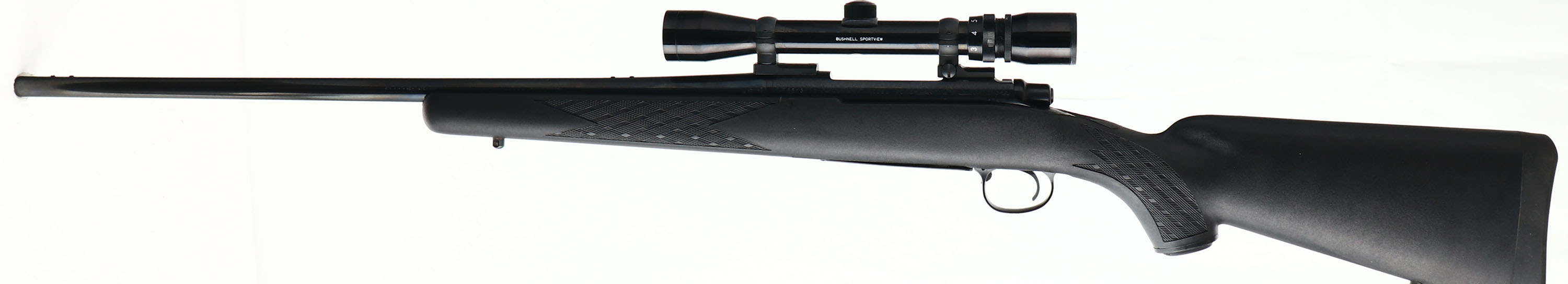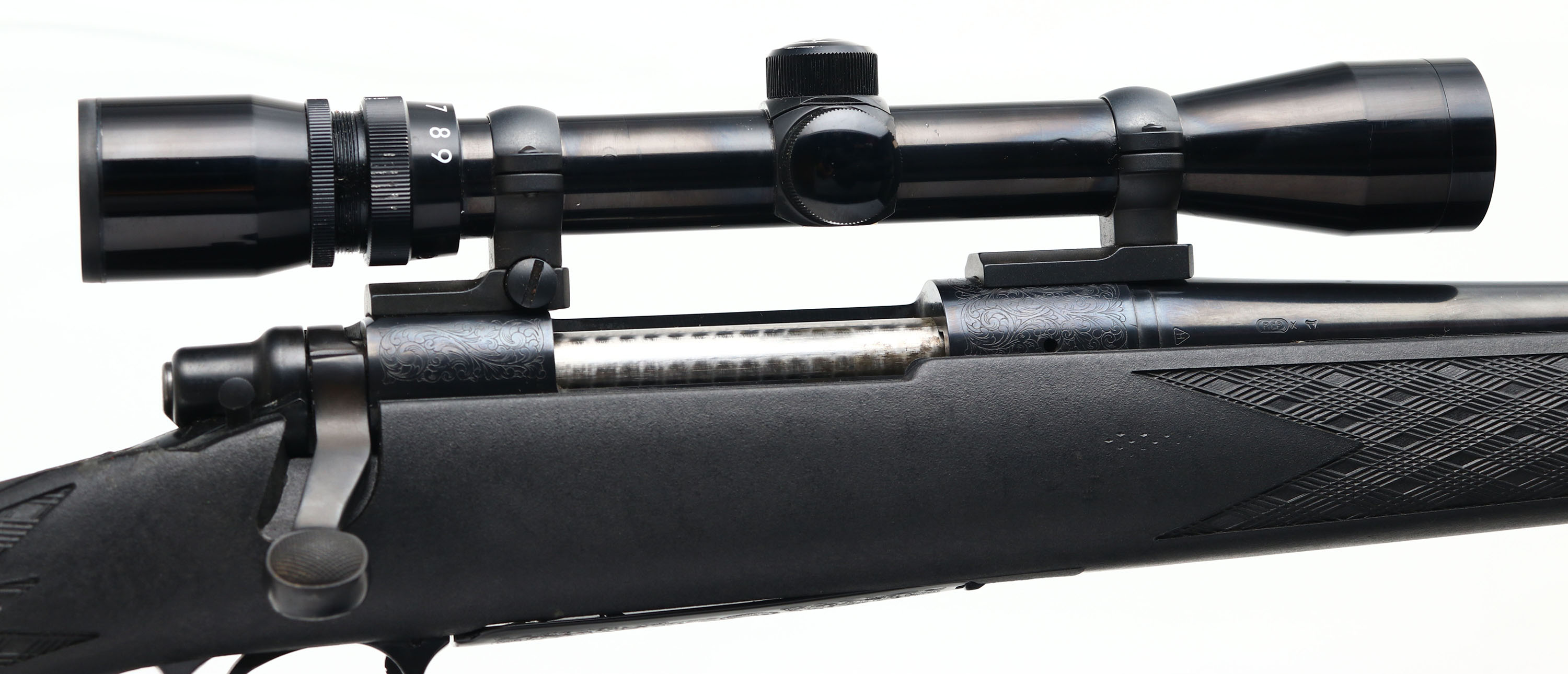 Remington Model 700, CAL: .338 Win Mag, MFG: Modern, SN: E6563832, Bolt Action Rifle, 24'' barrel. The rifle has been updated with a Ram-line checkered & capped pistol grip black synthetic stock, which is excellent. The receiver & floorplate display machine scroll engraving, with the bust of a Ram also on the floorplate. The original metal blue finish rates 95% overall. The bore is excellent. The receiver holds a Bushnell Sportview 3x-9x scope, while the original sights have been removed & the original holes screw filled. Sling studs. Jeweled bolt. Stock carries a solid recoil pad. A quality all weather hunting rifle. FFL Req. - Value: 400 to 800