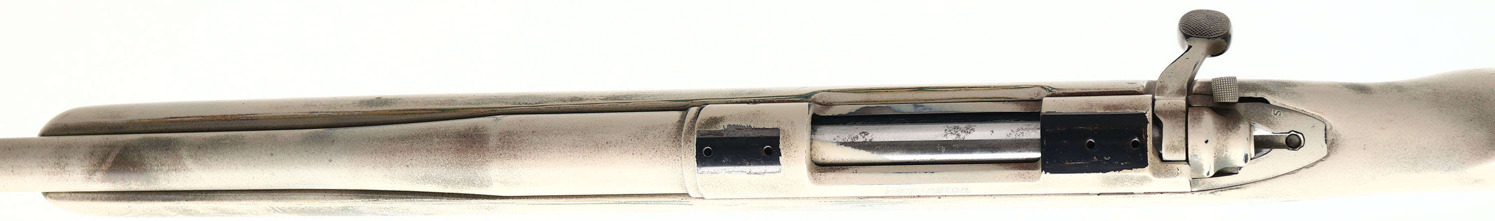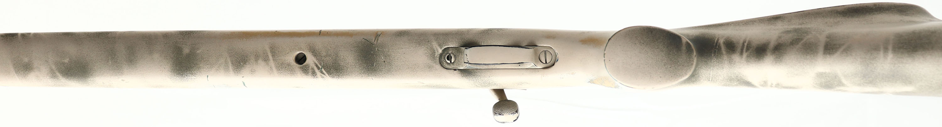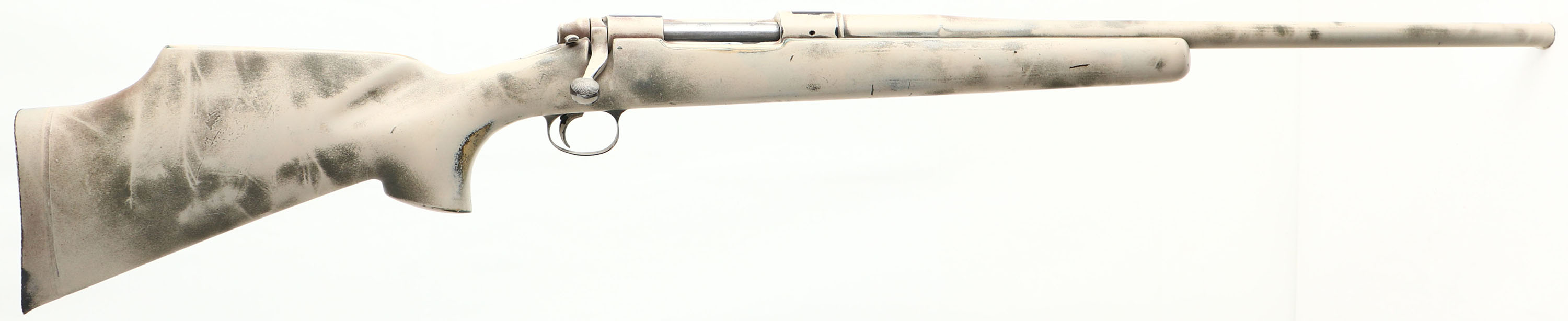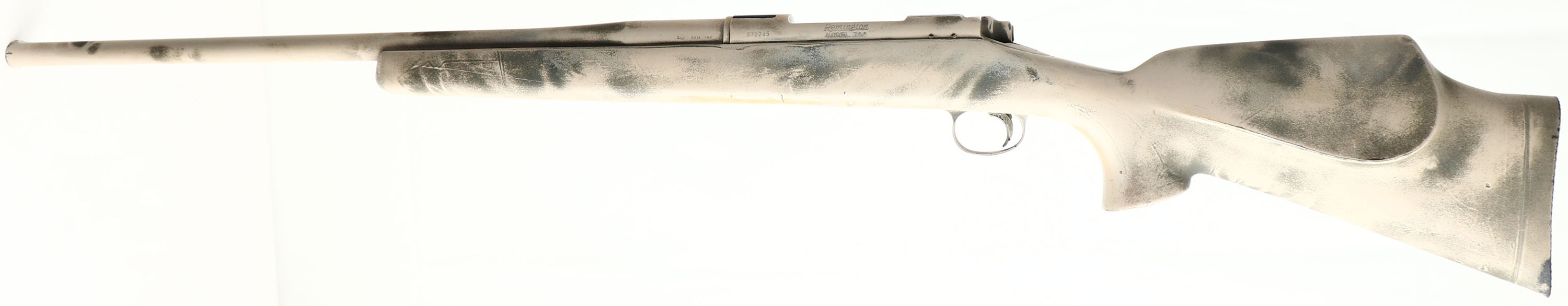 Remington Model 700 ADL, CAL: .280 REM IMP, MFG: Modern, SN: 372245, Bolt Action Rifle, 23'' barrel. The cheeked & flat pistol grip Monte Carlo synthetic stock very good & solid. The stock has receiver a non-professional winter or desert camouflage sprayed finish over the entire rifle, which shows wear at the carry points & edges, along with other small scratches & scrapes. The bore is excellent. The receiver once held scope blocks, which now gone have left the original finish exposed & the original holes open. There are no provisions for open sights. Jeweled bolt. Stock carries a solid recoil pad. It just needs some optics & maybe a respray to make it ready for your hunting trip. FFL Req. - Value: 300 to 500