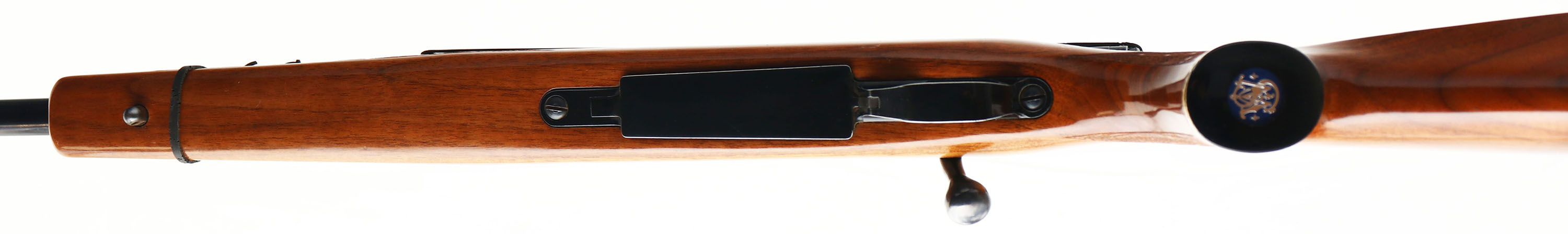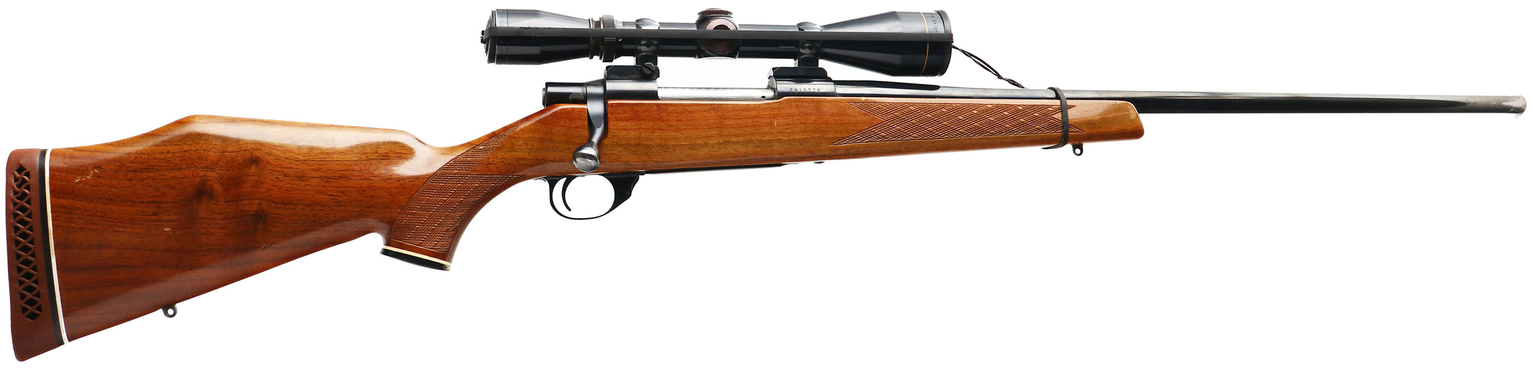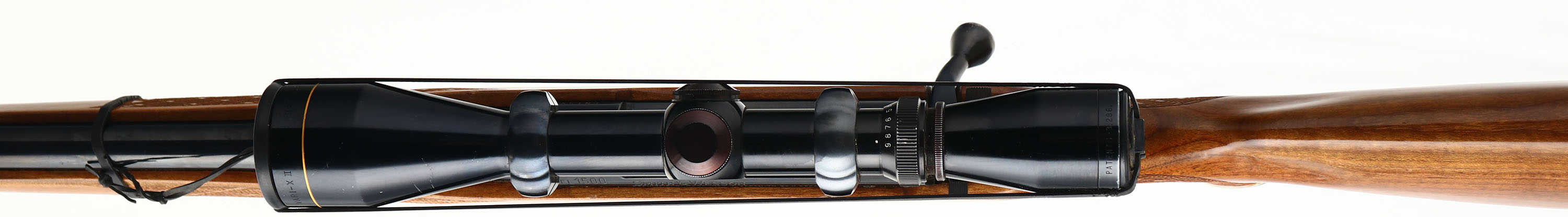 S&W, Model 1500, CAL: 7MM REM MAG, MFG: 1982-84, SN: PN15776, Bolt Action Rifle, 24'' Tapered steel barrel. Smith & Wesson, one of the largest handgun companies in the world, no longer makes a rifle. In 1984, the company discontinued production on all long guns, including the Model 1500 rifle. Rifles & shotguns were made for S&W by Howa Machinery, Ltd., Japan. This model's production run lasted for only two years & it has now become a collector's item. The original skip-line checkered, cheeked & capped pistol grip walnut stock is excellent. There are a half dozen minor scuffs scraps or scratches to the original finish. Some minor finish chipping around pistol grip cap. The metal blue finish rates 97% overall, with the majority of wear located at the muzzle end of the barrel. Bore is excellent. The receiver carries a Leupold Vari-XII 3X9 scope on Redfield blocks, with no provision for open sights on the barrel. Stock carries the factory S&W marked ventilated recoil pad. Whiteline spacers on buttpad & pistol grip cap. Sling studs. Jeweled bolt. A quality deer hunting rifle. FFL Req. - Value: 800 to 1500