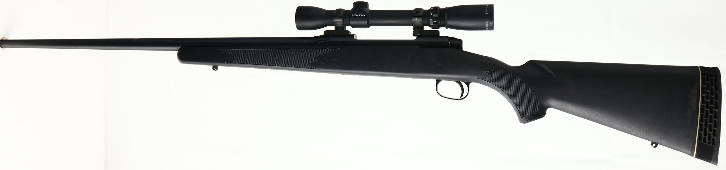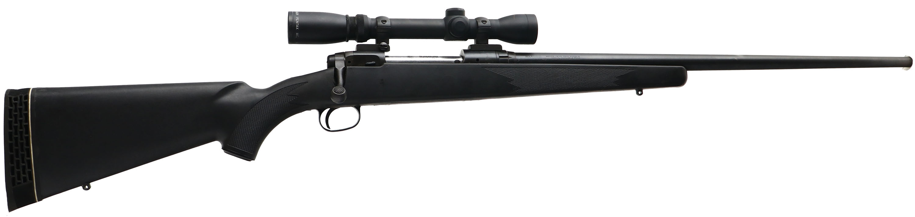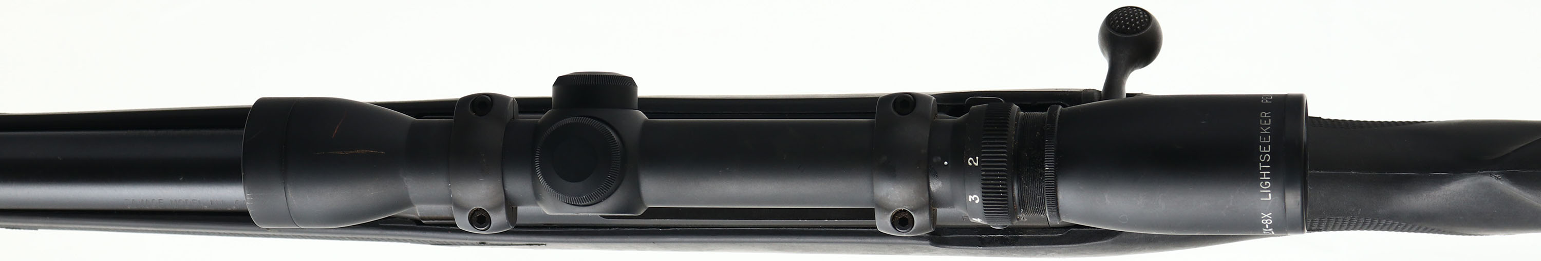 Savage, Model 111, CAL: 338 WIN MAG, MFG: Modern, SN: F601064, Bolt Action Rifle, 24'' Tapered barrel. The original checkered & capped pistol grip black synthetic stock is excellent, with small scrapes on stock near buttpad. The original metal black finish rates 99%. Bore is excellent. The receiver holds a Pentex Lightseeker 2x-8x scope, with no open sight provisions on the barrel. Stock carries a ventilated White-line Pachmayr recoil pad. Sling studs. An excellent condition modern hunting rifle. FFL Req. - Value: 400 to 600