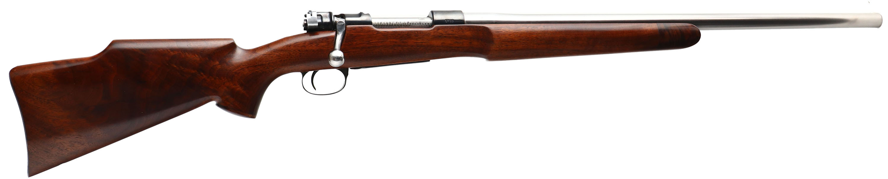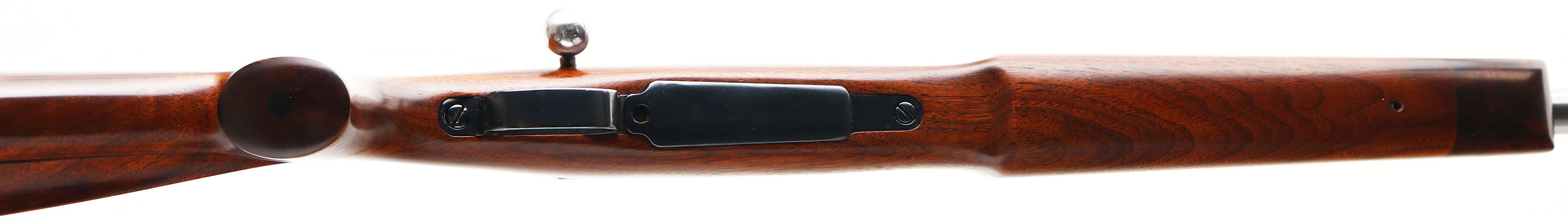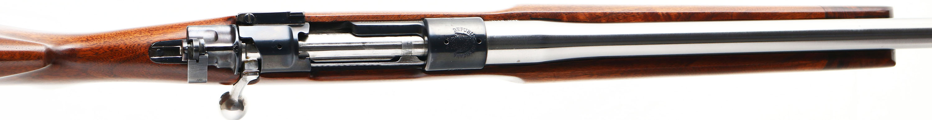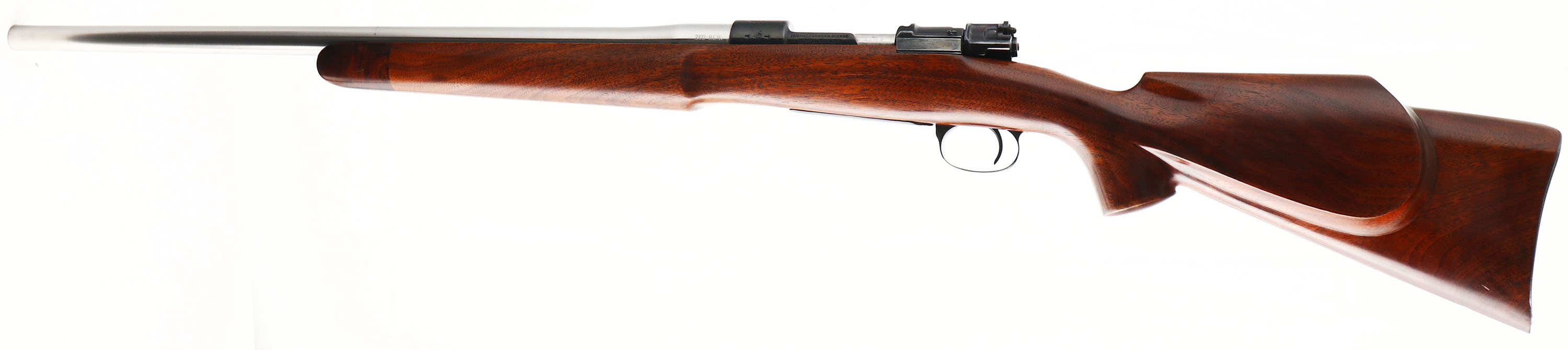 CUSTOM FN, Model 24 Mexican Bench Rifle, CAL: 260 REM, MFG: 1926-27, SN: 1799, Bolt Action Rifle, 24'' Bull barrel. Custom rifle made on a FN made Mauser action which was part of the Mexican contract for 3500 rifles. The custom checkered & capped pistol grip Monte Carlo walnut stock is excellent, with few handling marks to the excellent original finish. It displays wonderful rippled grain on the lower portion of the stock & a contrasting wood forend tip & pistol grip cap. The high luster metal reblue finish on the receiver, floorplate & trigger guard rates 95%, while the custom barrel is left in the white, likely stainless steel. No markings on barrel except caliber. Bore is excellent. The receiver has the Mexican eagle crest on the bridge & there are three open holes from a scope being removed. There are no provisions for open sights. Jeweled bolt. Buttstock carries a widow's peak, checkered metal buttplate. Sling studs have been removed. A very sharp looking & nicely configured custom Mauser bench rifle. FFL or C&R Req. - Value: 500 to 1000