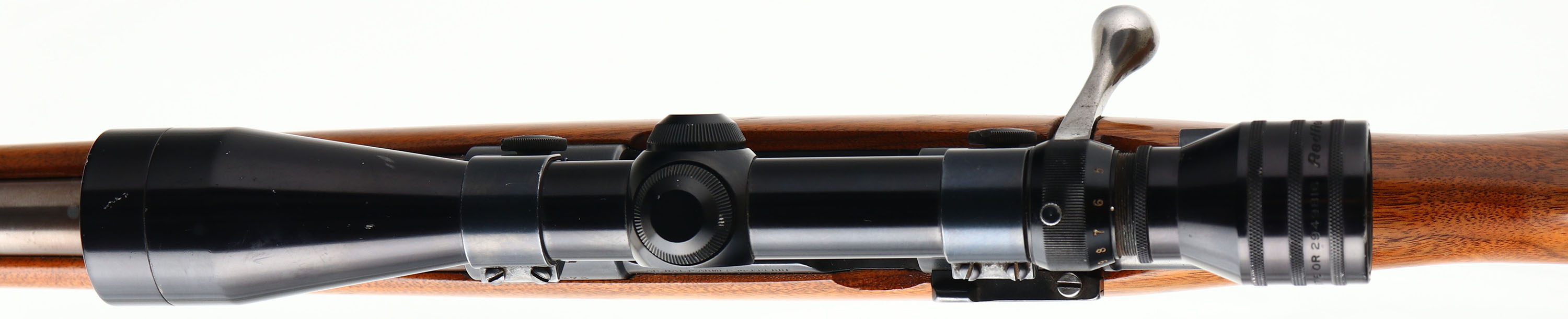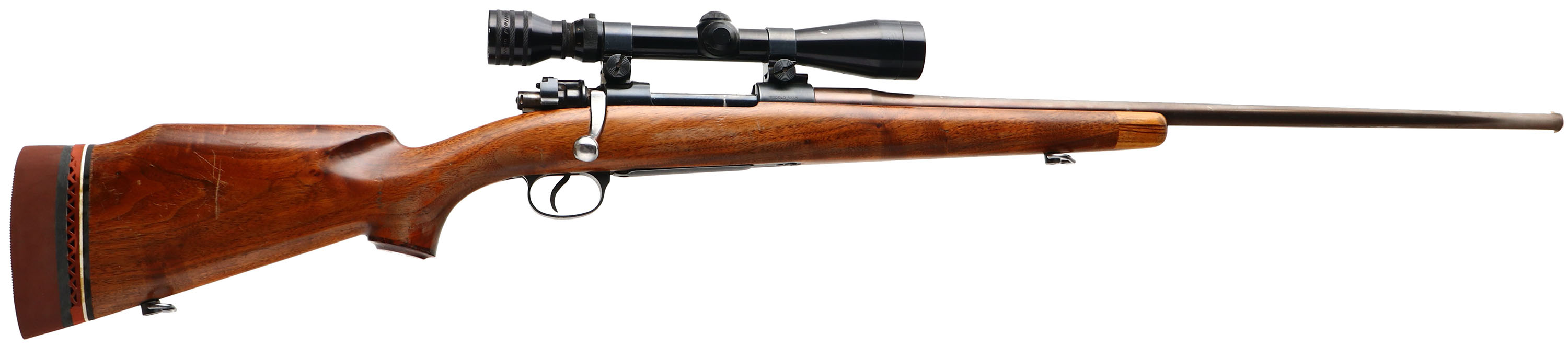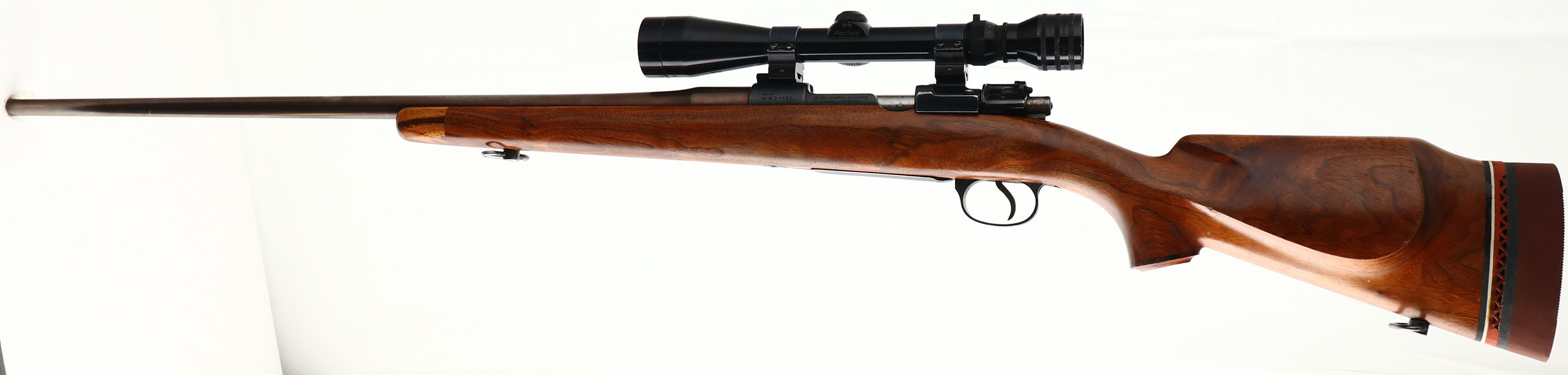 Custom Argentine Contract Mauser, Modelo 1935 Custom Sporting Rifle, CAL: 6.5-06, MFG: 1935-40's, SN: 28376, Bolt Action Rifle, 26'' W.H Hobaugh custom barrel. The Custom Monte Carlo, capped pistol grip stock, with raised cheek & blonde forend tip is very good & solid. There are worn thin & dull areas in the finish, with some small scratches, scrapes & dings. The metal finish on the barrel has a plum/bronze tint. The restored metal finish on the receiver rates 90%. Bore is excellent. The receiver holds a Redfield 3x-9x scope, with no open sight provisions on the barrel. Stock has an oversized KICKEEZ recoil pad on top of a cut partial ventilated recoil pad. LOP is 13 3/4'' over pad, Sling loops. A quality sporterized Mauser. FFL or C&R Req. - Value: 300 to 600
