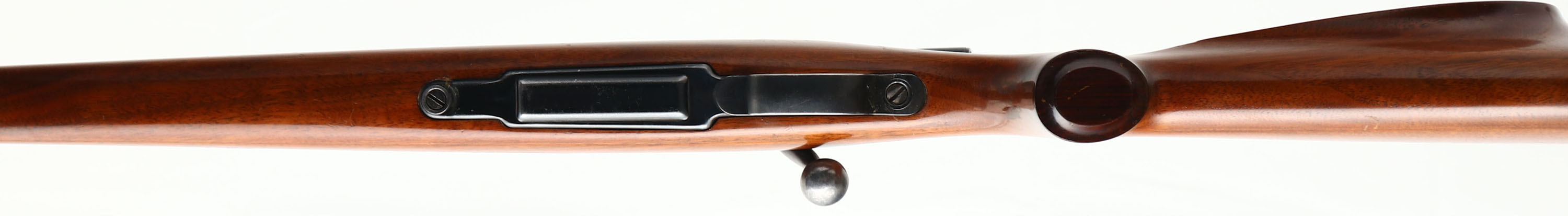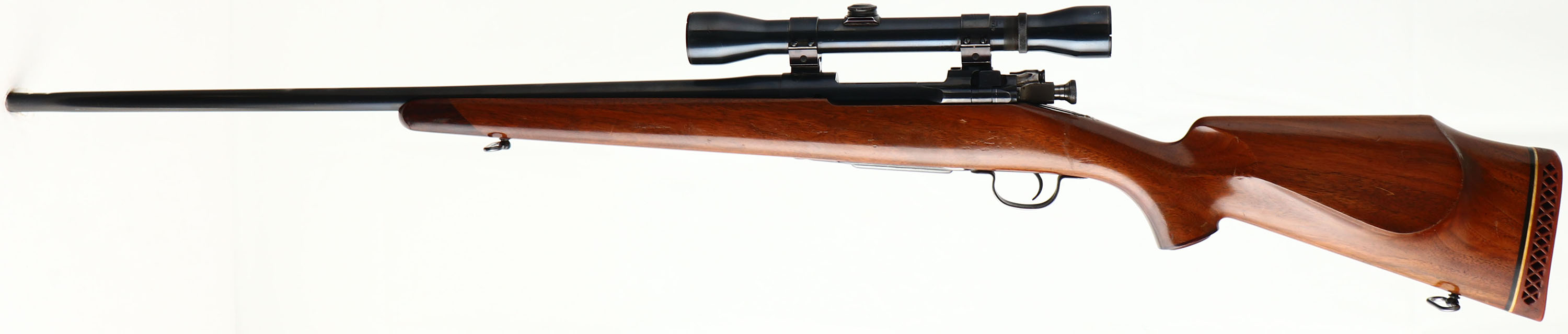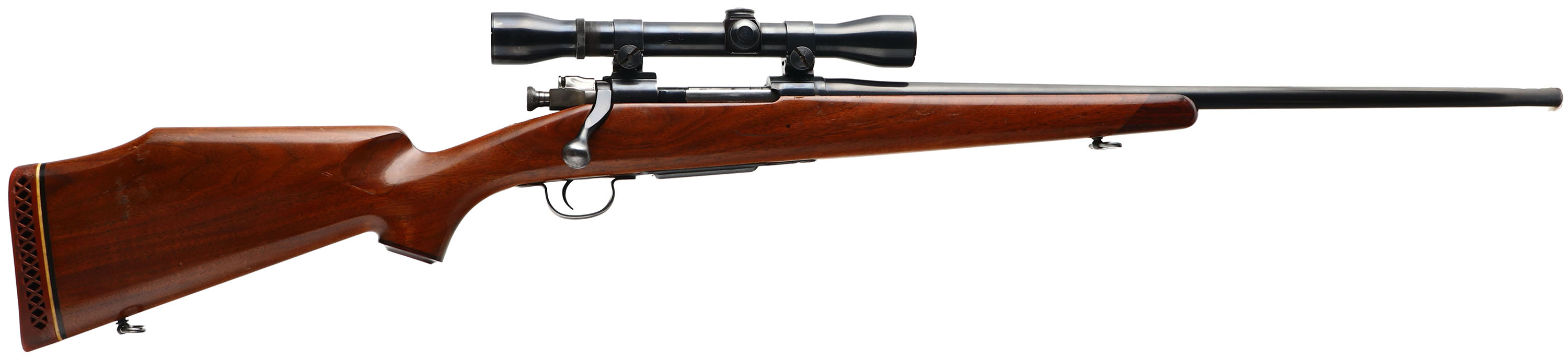 CUSTOM U.S. Smith Corona, Model 03 A3 Custom Sporting Rifle, CAL: 30-06 Ackley Improved, MFG: 1943, SN: 3614706, Bolt Action Rifle, 24 1/4'' tapered barrel. The .30-06 Ackley Improved is a wildcat cartridge formed by firing a .30-06 Springfield cartridge in a rifle that has been chambered or re-chambered for the ''improved'' version. Upon firing, the case ''blows out'' to conform to the new, enlarged chamber. The new dimension has a reduced body taper & increased shoulder angle compared to the original .30-06 Springfield case. By doing so, the volume is increased a small amount, less than five percent. You cannot get the fatter case of a .30-06 Ackley Improved into a standard .30-06 Springfield rifle chamber, but the reverse is obviously true. The custom cheeked & capped pistol grip Monte Carlo wood stock on this rifle is very good & solid, having a slant cut rose wood forend tip in the style of Weatherby stocks. There are numerous small scrapes, scratches & contusions to the original finish. The barrel & receiver have been polished & smoothed from their military days when they would have been parkerized finish. They now having a typical sporting rifle hot blue rating 90% overall, with more wear on the floor plate & trigger guard. Bore is very good & bright. The receiver carries a Weaver K4 60-C scope on Weaver rings & mounts. There are no open sights on barrel as the original front sight was removed during the sporterizing of the rifle. Buttstock carries a ventilated recoil pad. Sling studs. A solid custom built sporting rifle in a unique caliber. FFL or C&R Req. - Value: 300 to 600