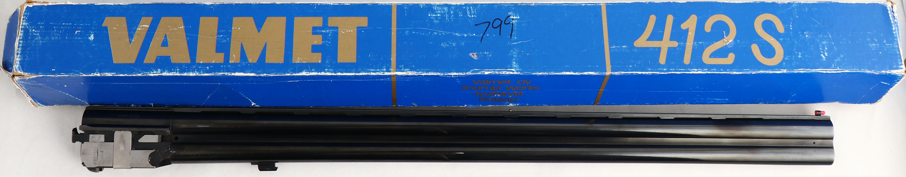 Valmet, Model 412, CAL: 30-06/12GA, MFG: N/A, SN: 210069, Break Action O/U Combo Gun, 23 5/8'' barrels. The original Monte Carlo checkered & flat pistol grip stock is excellent, with minor handling marks & contusions to the original finish. The original metal blue finish rates 99% overall. The receiver has gold tone fill accenting the lettering & receiver embellishments. Bores are excellent & minty. The solid rib holds a folding rear sight & triangle blade front sight. Sling mounting provisions. Stock has ventilated recoil pad. This rifle is accompanied by a boxed Valmet Model 412 S O/U 12GA interchangeable shotgun barrel. A high condition, Finnish made rifle/shotgun combo gun. FFL Req. - Value: 1000 to 2000