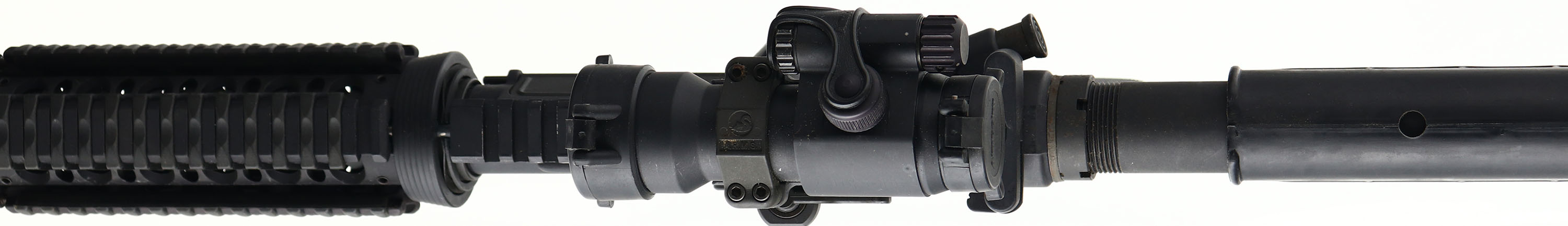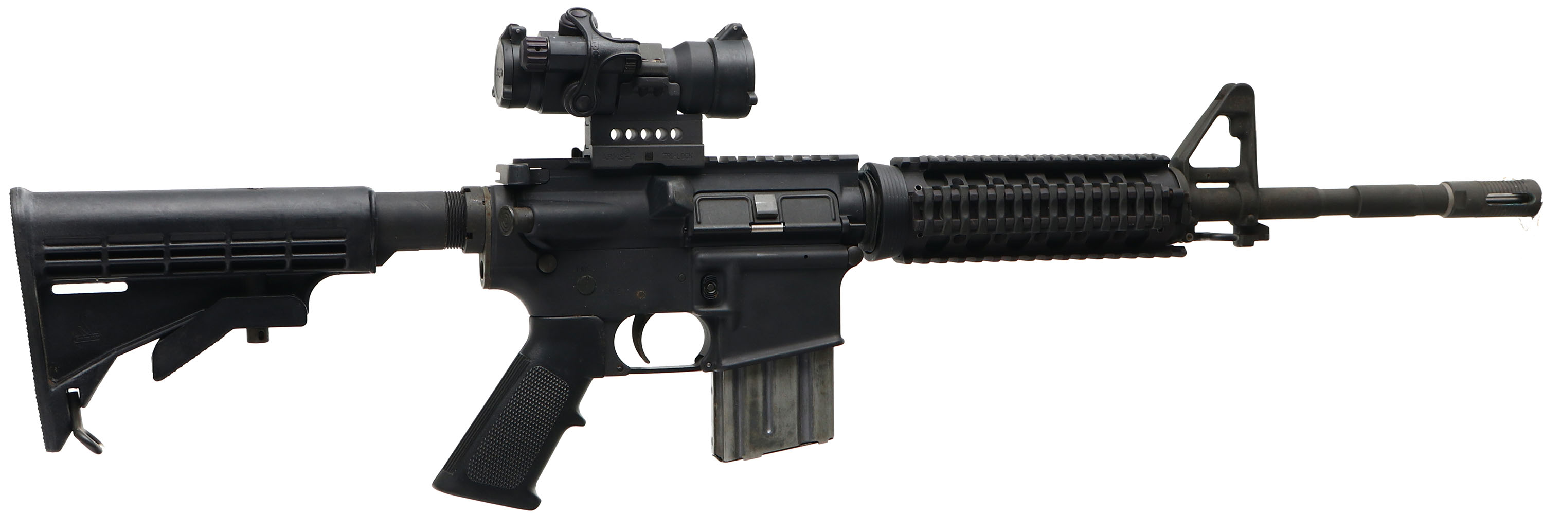B.F.I (Bushmaster), Model XM15-E2S, CAL: .223/5.56, MFG: Modern, SN: L362118, Semi Auto Rifle, 15'' barrel 16 1/2'' with muzzle brake. The checkered synthetic grip & composite 6pt adjustable stocks are excellent, with handling marks. The matte black finish on the receiver rates 95%. The parkerized finish on the barrel is very good, with spotting/speckling. Oxidization in the muzzle brake. Bore is excellent. The rifle is fitted with a Aimpoint CompML2 4 MOA scope. Quad picatinny forend for accessories. SureFire picatinny rubber grips. Stock has a checkered plastic buttplate. Sling loops. Colt AR-15 mag. FFL Req. - Value: 400 to 800