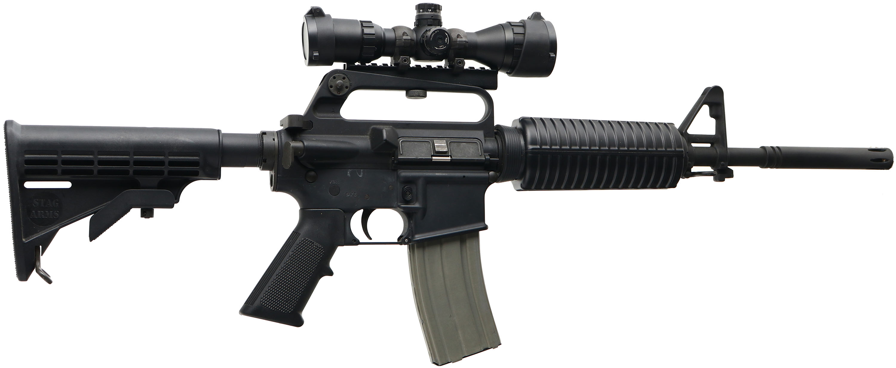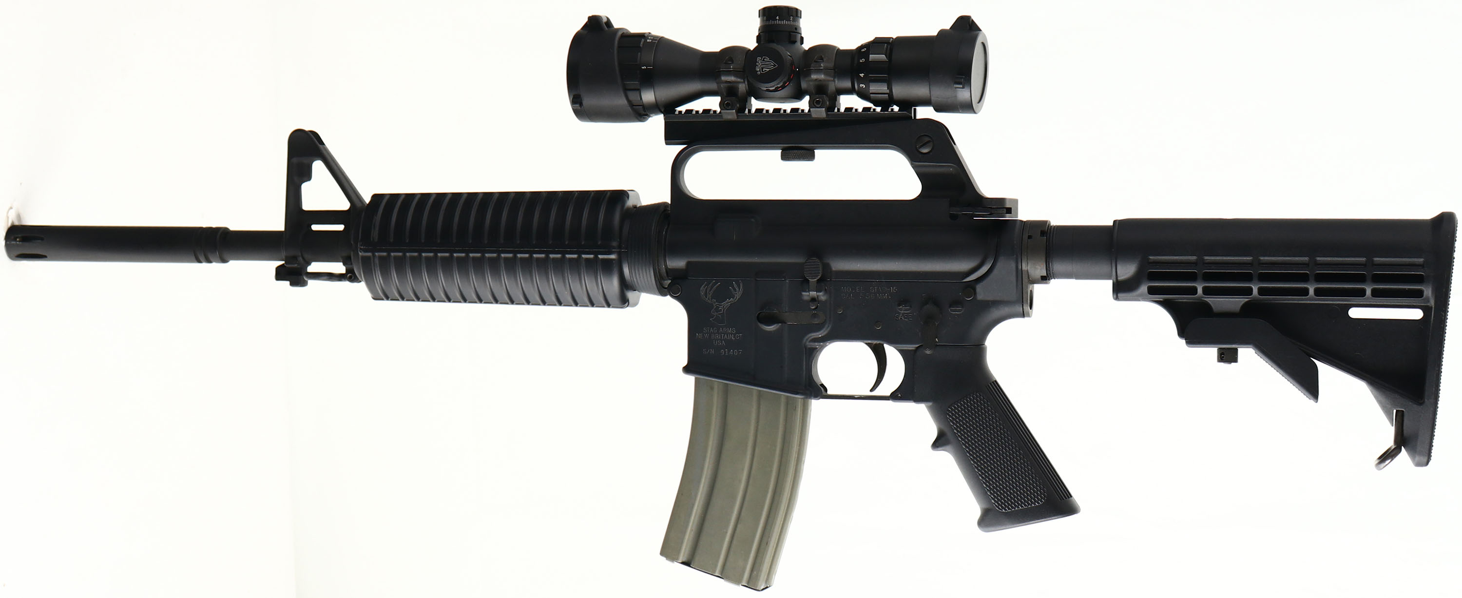 Stag Arms, STAG-15, CAL: 5.56, MFG: Modern, SN: 91407, Semi Auto Pistol, 16 1/2'' barrel. The synthetic checkered grip & Stag 6pt adjustable stock are excellent. The matte black finish rates 95%, with some spotting on the left side of the lower. Bore is excellent. Factory iron sights & a UTG 3-9x32AO Mil-Dot scope. Sling loops. 30rnd steel mag. FFL Req. - Value: 400 to 800