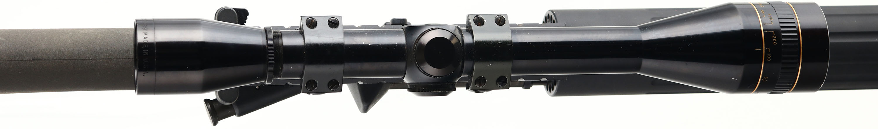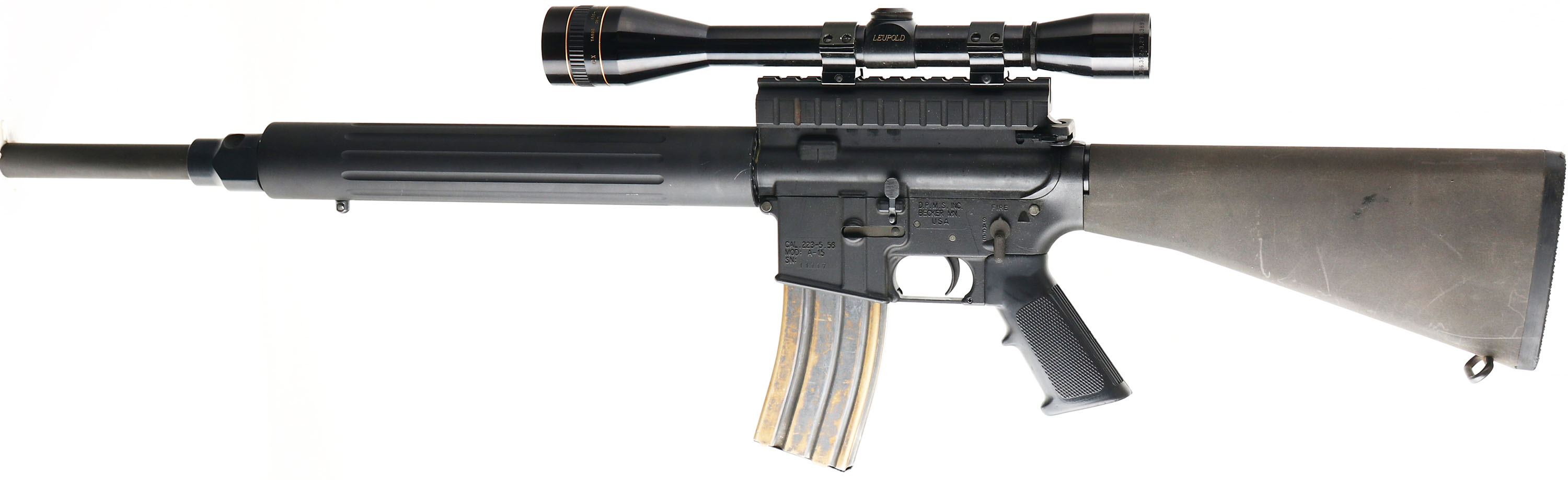 DPMS, AR-15, CAL: .223/5.56 (barrel marked .223), MFG: Modern, SN: 11117, Semi Auto Rifle, 20'' barrel. The synthetic checkered grip, composite stock & fluted metal forend are all excellent, with handling marks & scuffs. The matte black finish on the upper, lower & barrel rates 95%. The finish on the receiver has a grainy texture & the metal blue finish on the barrel is smooth. Bore is excellent. The rifle is fitted with a Leupold Gold Ring 12x scope. No open sights. Sling loop & stud. Magazine is worn, with brown patina. FFL Req. - Value: 400 to 700