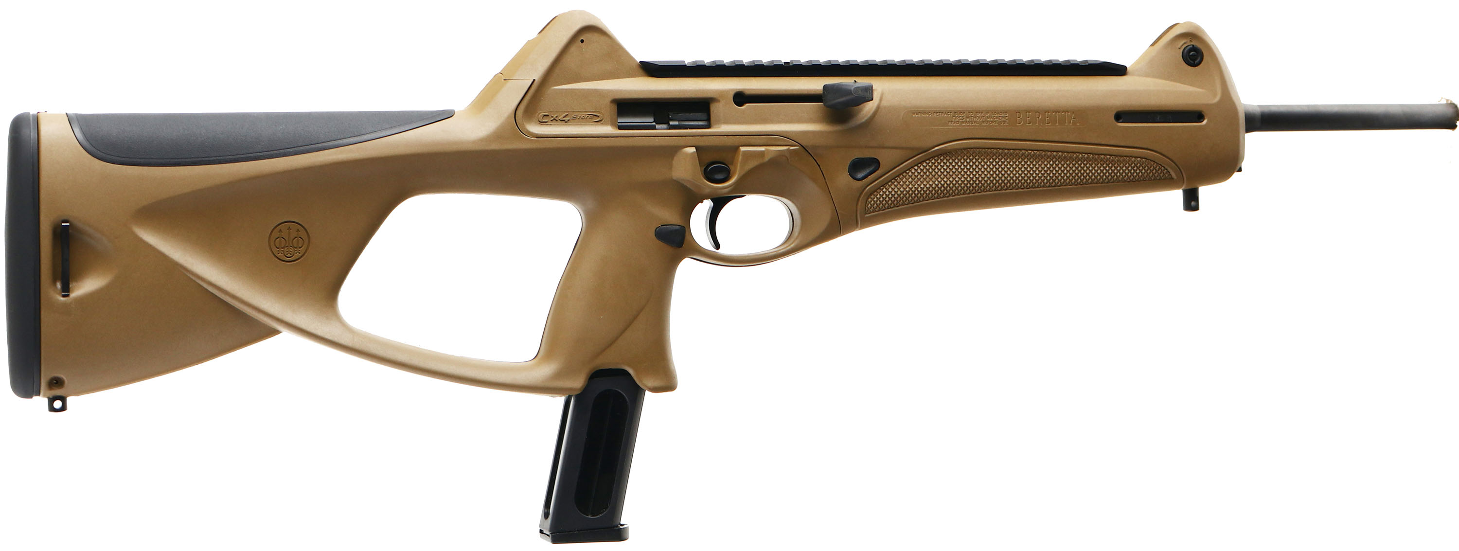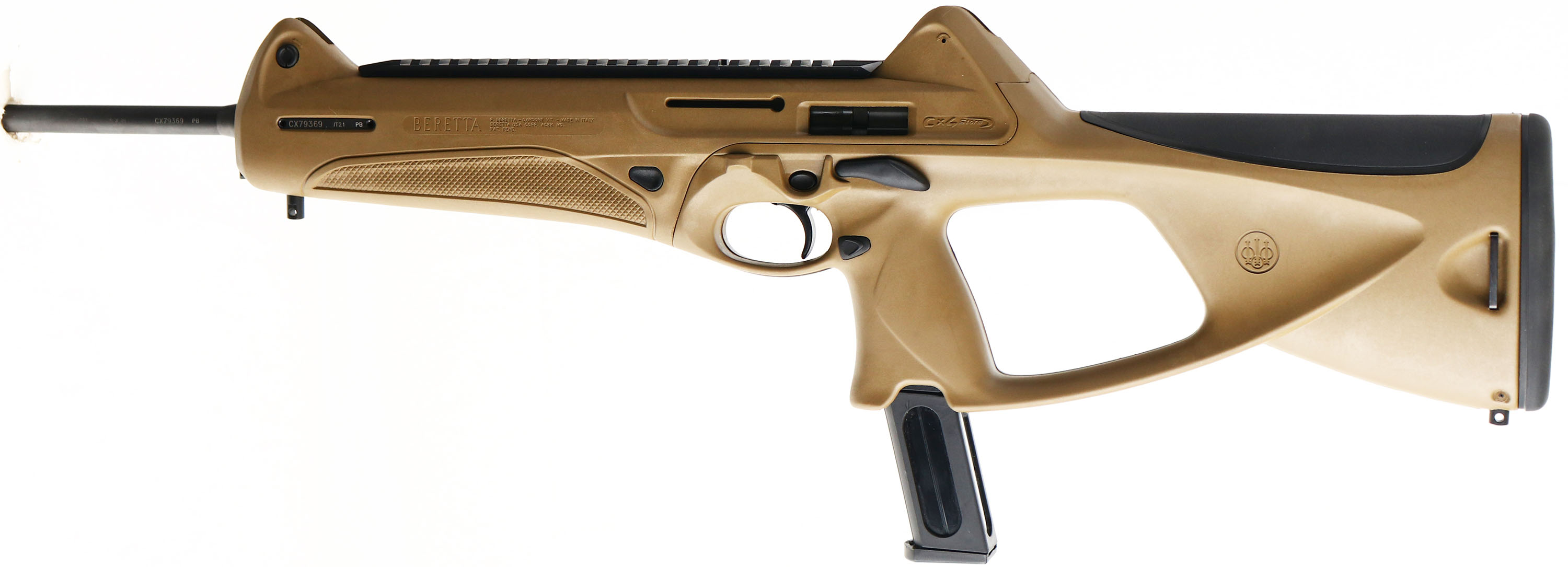 Beretta, Model CX4 Storm, CAL: 9mm, MFG: Modern, SN: CX79369, Semi Auto Rifle, 16 1/2'' barrel. The Beretta factory desert tan composite stock is excellent, with minor handling marks. The metal blue finish rates 99% overall. Bore is excellent. Integral peep & post sights. The receiver holds a factory 10'' picatinny rail for optics. Stock carries sling studs & a solid black rubber recoil pad. Comes with a 20 & 30rnd mag. FFL Req. - Value: 500 to 800