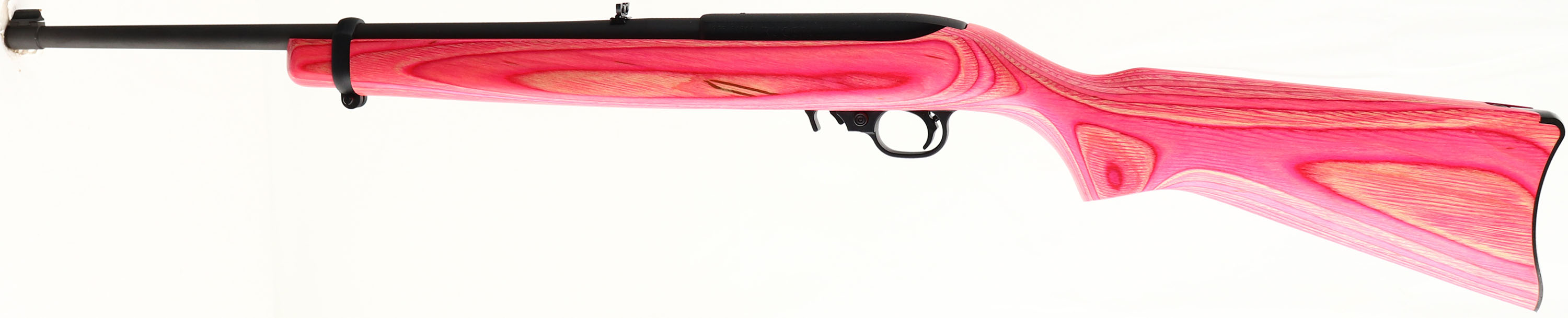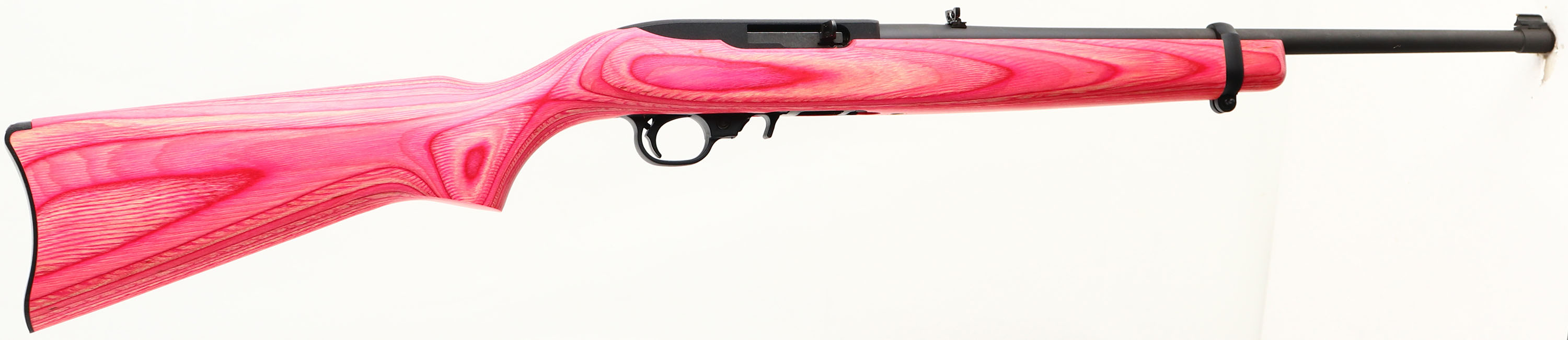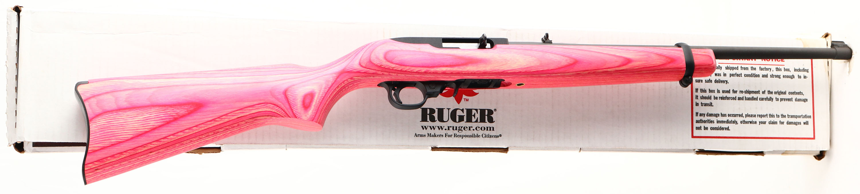 BOXED, Ruger 10/22, CAL: 22LR, MFG: Modern, SN: 352-64848, Semi Auto Rifle, 18 1/2'' barrel. The pink laminated flat pistol grip wood stock is excellent. The parkerized finish on the barrel is excellent & the textured matte black finish on the receiver is excellent. Bore is excellent. The barrel has a folding leaf rear sight & a beaded blade front sight. Stock has a smooth metal buttplate. Comes in factory box, with related paperwork & lock. FFL Req - Value: 250 to 400