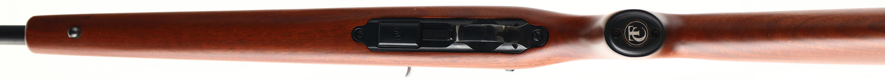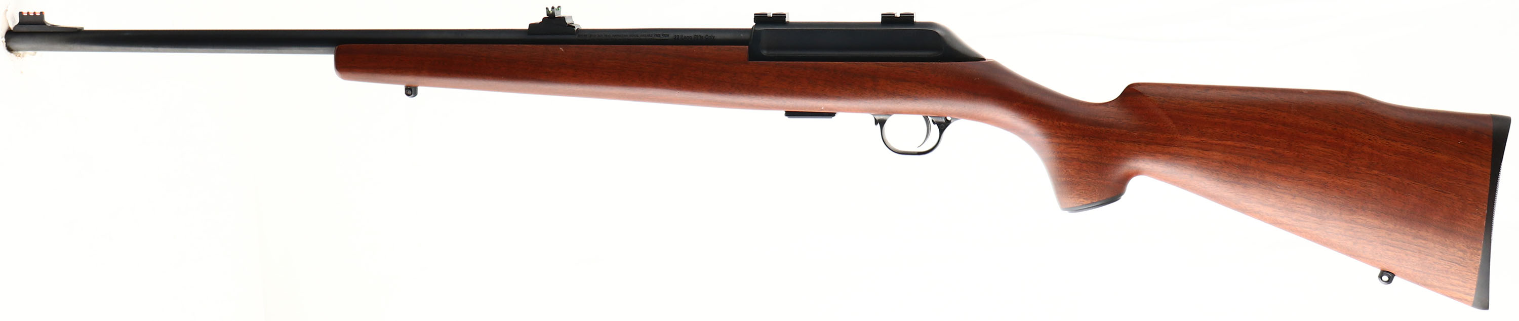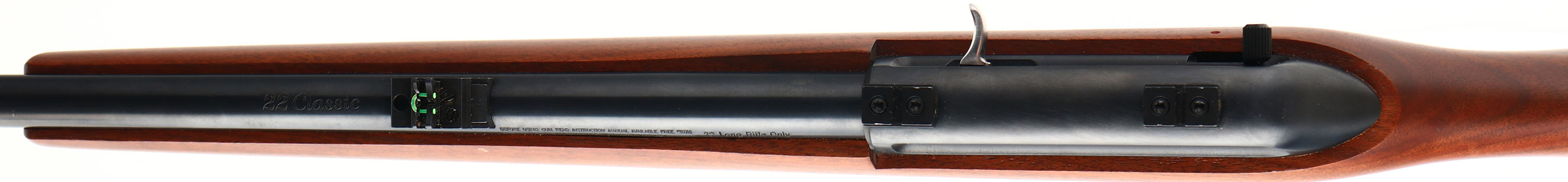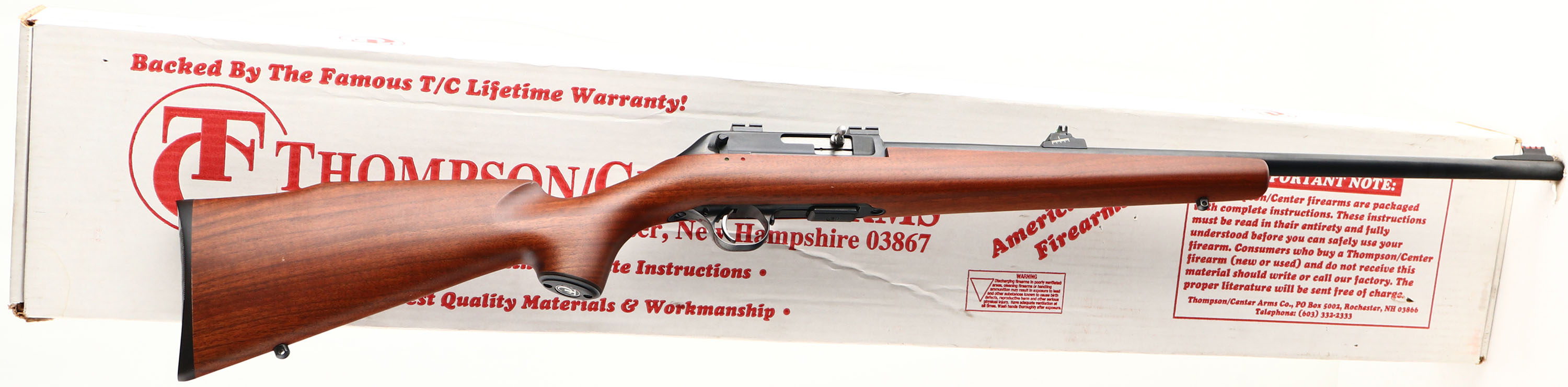 BOXED, Thompson Center Arms Co, Model 22 Classic, CAL: 22LR, MFG: Modern, SN: 4650, Semi Auto Rifle, 22 1/4'' barrel. The capped pistol grip Monte Carlo wood stock is excellent. There are a couple minor handling dings to the finish. The metal blue finish rates 99% overall. Bore is excellent. The barrel holds a slide adjustable green fiber optic rear sight & tall orange fiber optic rail front sight. Stock has a TC grooved plastic buttplate. Sling studs present. Receiver has scope bases. FFL Req. - Value: 200 to 300