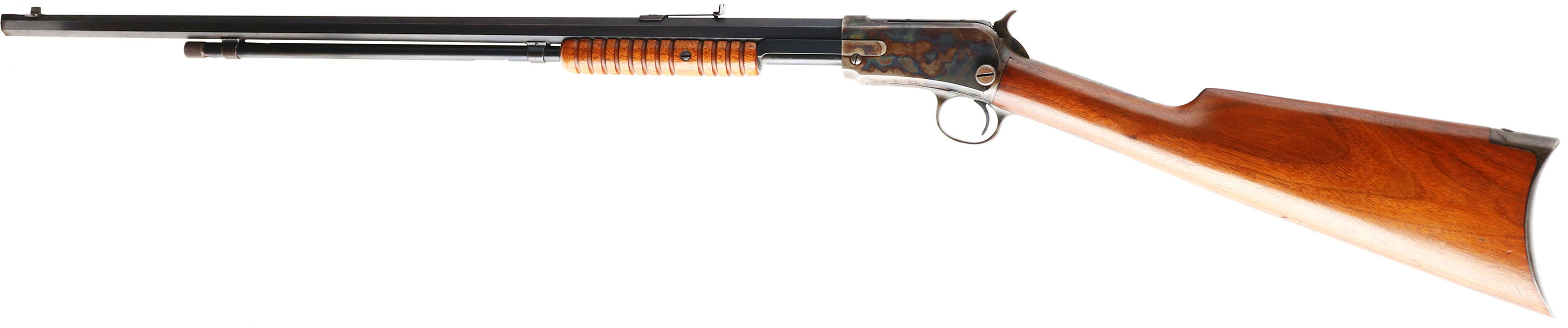 Winchester, Model 1890 2nd variation, .22 SHORT Cal., MFG. 1900, SN: 96971, Pump Action Rifle, 24'' Octagon barrel. The original straight grip wood stocks are excellent, with very few tiny handling marks to the excellent original finish. The original metal blue finish on the barrel & mag rates 97%. The case-hardened receiver displays vivid case-colors, with muting on the trigger guard & tangs. The barrel holds the original adjustable rear & blade front sights. The bore is good, with haze & roughness amongst strong rifling. The crescent metal buttplate displays faded case colors. Tight smooth action. This rifle has an excellent overall appearance & is an extremely nice early case-colored, 2nd variation, Short only rifle. Difficult to improve upon.* FFL or C&R Req. - Value: 6000 to 8000