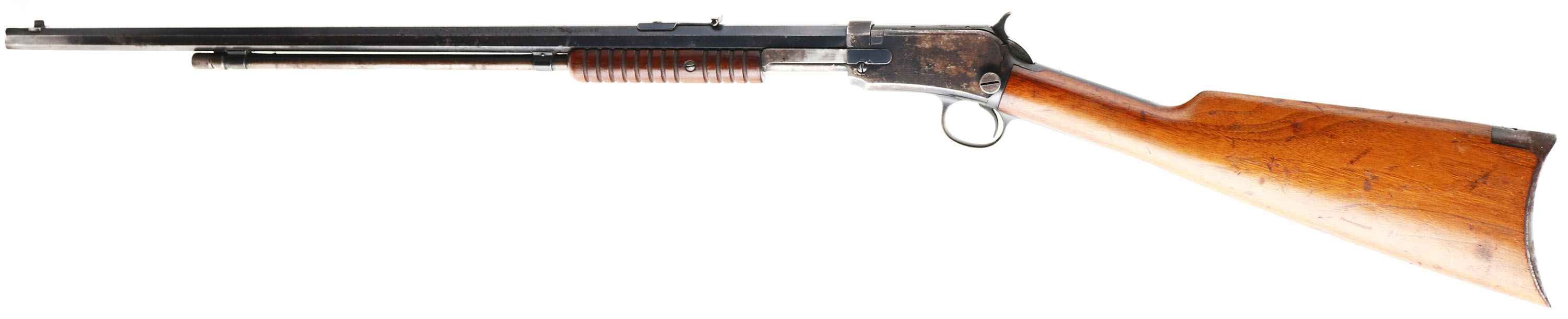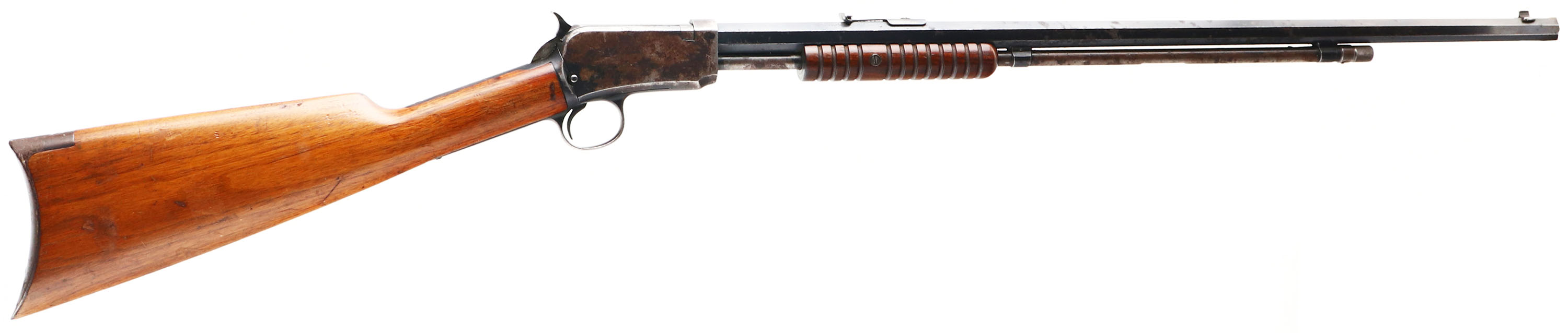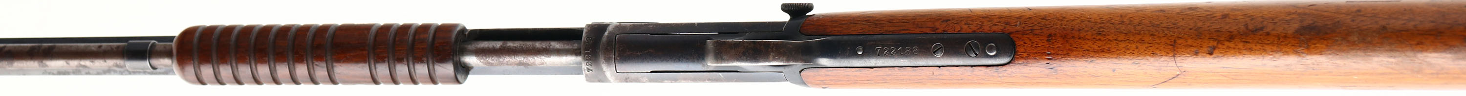 Winchester, Model 90, 3rd variation, .22 WRF, Cal., MFG. 1926, SN: 722188, Pump Action Rifle, 24'' Octagon barrel. The original straight grip wood stocks are very good, retaining the majority of original finish, but thinning at the carry points. There are several minor handling marks, thin scratches, scrapes & contusions. The metal blue finish on the barrel rates 80%, but with lots of spots of rust pitting. The mag tube finish has worn to a thinning brown patina, with lots of spots of rust pitting. The receiver blue has flaked & worn thin to about 20% remaining blue & worn areas having a thin brown patina. The barrel carries a standard adjustable rear & small blade front sights. Bore is excellent. Crescent metal buttplate. Smooth tight action. A very good shooter with the excellent bore that would benefit from metal clean-up. FFL or C&R Req. - Value: 500 to 1000