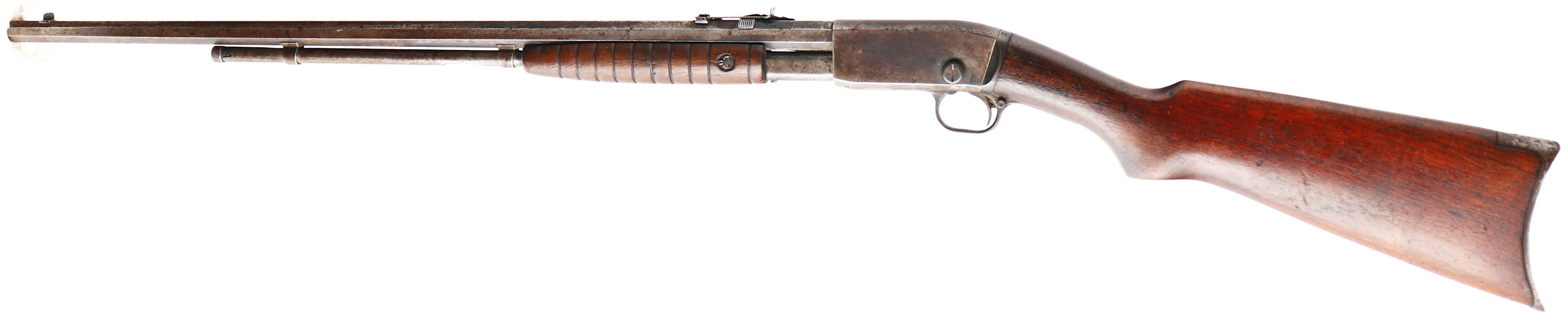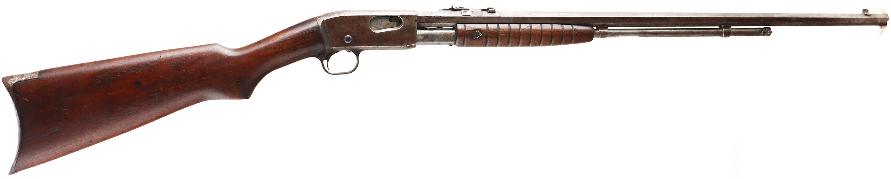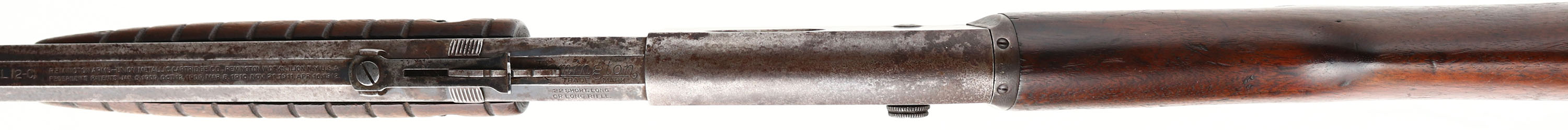 Remington, Model 12C, .22 S. L. & LR., MFG. 1909-36, SN:510383, Pump Rifle, Take-down, 24'' Octagon barrel. The straight grip wood stocks are very good & solid, however the original finish is worn thin & has darkened from use & added oils. There are numerous minor scuffs, scratches or contusions, along with a 1'' crack on the right side of the forend. The original metal blue finish has worn gun metal gray, with a spotty brown patina & pitting. Barrel carries replacement adjustable rear & small blade front sights. Bore is poor, with lots of pitting & scarring amongst worn rifling. Original crescent metal buttplate. A candidate for restoration. FFL or C&R Req. - Value: 150 to 300