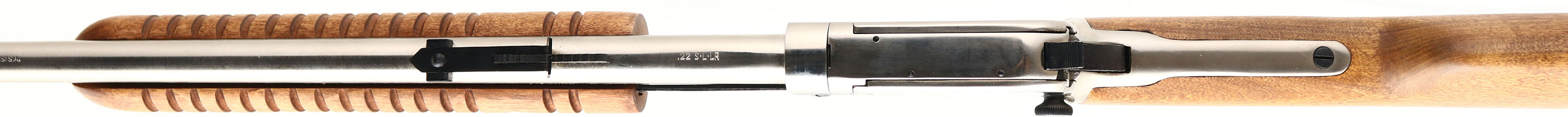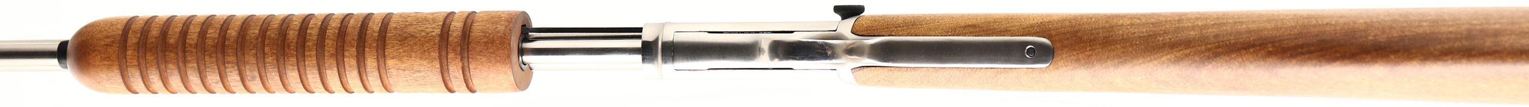 BOXED Rossi Model 37, marked .22 S.L. LR., MFG: 1980's, SN: G382012, Pump Action Rifle, 23'' round barrel. This is a Rossi reproduction or copy of the Winchester 62. The original blond straight grip wood stocks are excellent & carry the original excellent finish, with no wear. The original matte stainless finish on the barrel & tube, & polished stainless on receiver all rate 100%. Bore is new. Barrel has factory sights. Buttplate is original. Comes in the correct factory box, with owner's manual & packaging. An excellent, original & fairly rare little pump rifle. FFL Req. - Value: 300 to 500