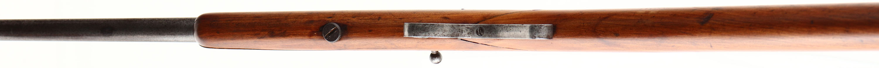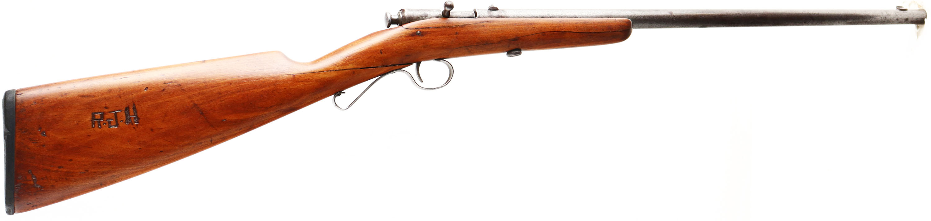 Winchester, Model 1902, CAL: 22 S Long & Ex Long, MFG: 1902-31, SN: NSN, Bolt Action Rifle, 18'' barrel. The original straight grip wood stock is poor, with a 5'' crack on each side of the wrist, a 3'' crack below the loading port & a 7'' crack emanating from the forend tip, all have glue attempted repairs. Despite the various cracks, the stock is fairly solid. There are also minor contusions, scrapes & dings. There is a ribbon of tick marks on the left side of stock & the initials ''RJH'' carved into the right side. The finish appears original. The metal finish has worn gun metal gray, with a spotty thin brown patina & speckling. Bore is poor, with no visible rifling, roughness & pitting. The barrel holds a factory rear & small blade front sights. Stock carries the original worn hard rubber buttplate. A possible candidate for a restoration project as its all here despite condition. FFL or C&R Req. - Value: 30 to 100