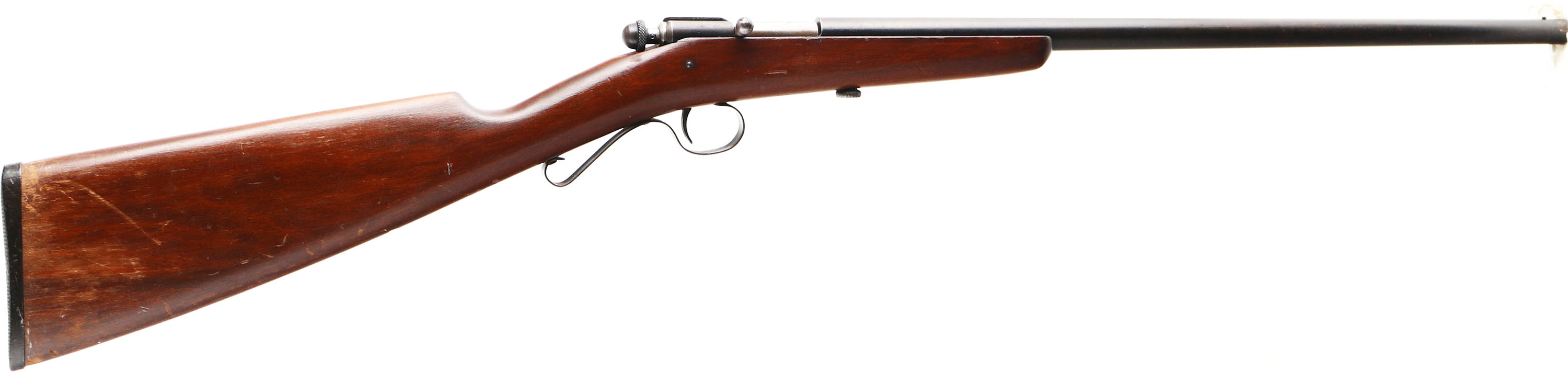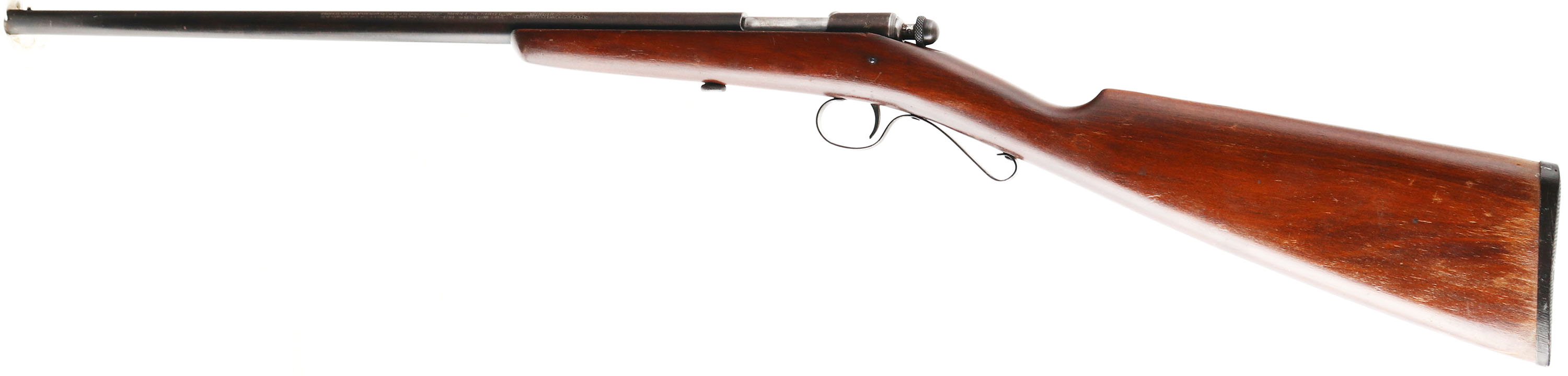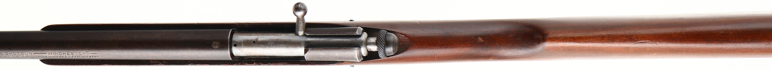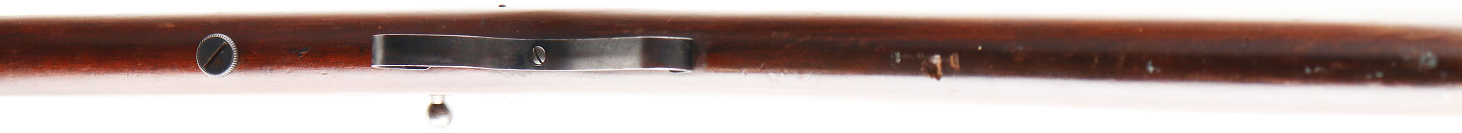 Winchester, Model 36 SHOTGUN, 9mm Rim Fire Cal., MFG. 1920-27, SN: None, Bolt Action Rifle, Only 20,000 produced, 17 1/2'' Tapered round barrel. The original straight grip wood stock is very good, with the original finish.. There are several small scrapes, scratches & contusions mainly on the lower right side of the stock. The original metal finish rates 40% overall, with areas of thinning toning to a brown patina, Scalloped trigger guard. Bore is excellent. Single bead front sight. Original ''Winchester'' plastic buttplate, with engraved screw heads. A solid original example of a rare & collectible little smoothbore/shotgun. FFL or C&R Req. - Value: 400 to 800