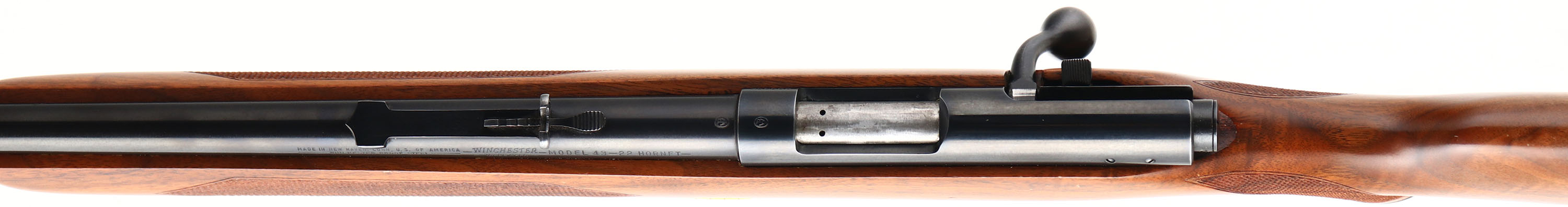 RARE Winchester, Model 43 ''Special Model'', CAL: 22 Hornet, MFG: 1950, SN: 28595A, Bolt Action Rifle, 24 1/2'' barrel. The original deluxe checkered & capped pistol grip wood stock is excellent, with a couple of minor handling marks & dings. Excellent original finish. The factory metal blue finish rates 99% overall. Bore is excellent, with sharp rifling. The barrel holds an adjustable rear sight & ramped hooded front sight. Buttstock carries a checkered metal buttplate. Factory sling loops. Comes with the factory mag marked ''MODEL 43 22 HORNET'' & a repro hang tag. During the 5 years of production, 1948 to 53, less than 63,000 model 43 rifles were produced. Of those, very few were deluxe ''Special Models''. Collector's typically add 100% to value for the deluxe ''Special Models''. A high condition deluxe rifle that's very collectible & desirable.* FFL or C&R Req. - Value: 4000 to 5500