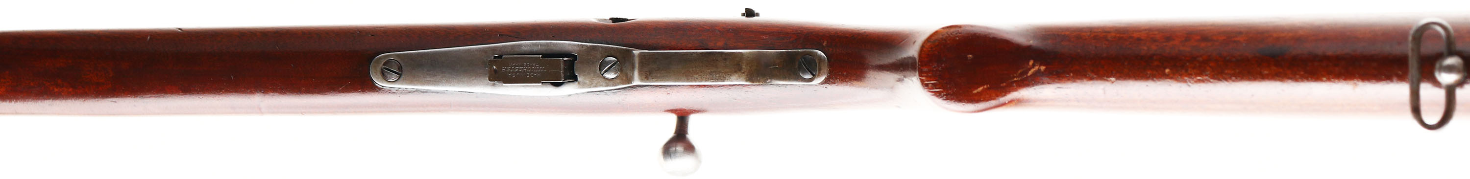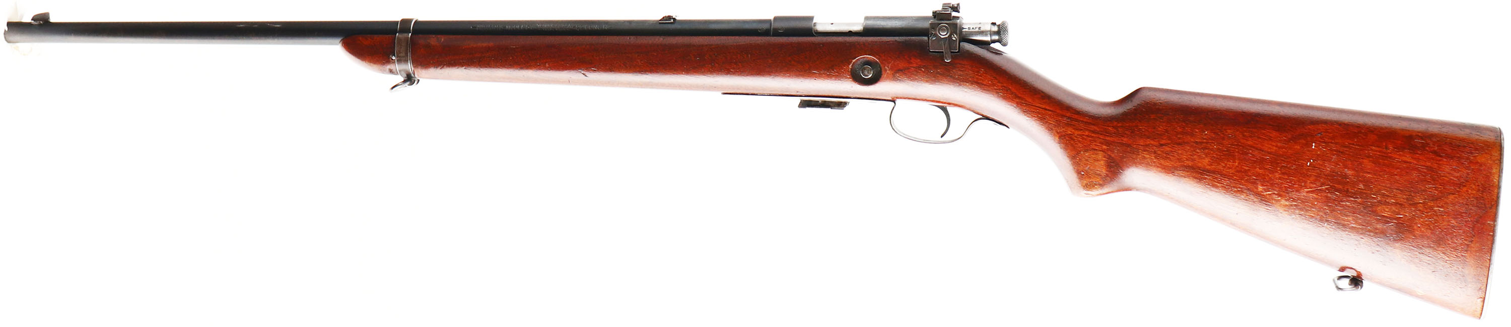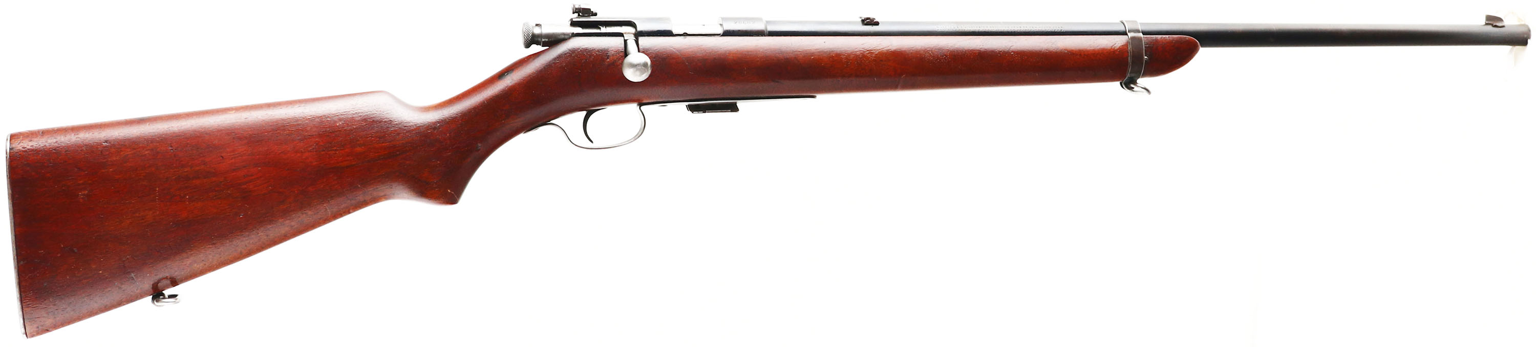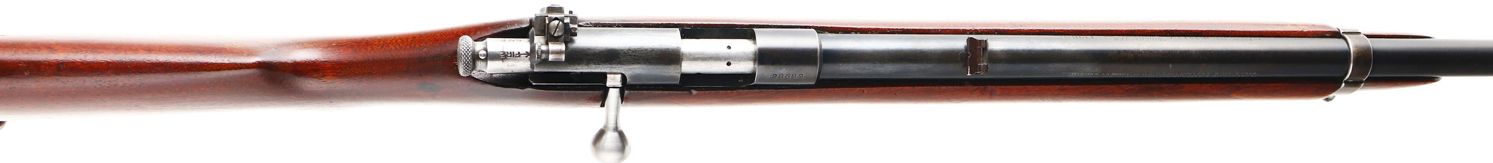 Winchester, Model 57 Target, .22 LONG R. Cal., MFG: 1927-37, SN: 28682, Bolt Action Rifle, Mag fed, 22'' barrel, with barrel band. The original flat pistol grip wood stock is excellent & solid, with minor handling marks & scuffs to the original finish, with an added layer of protective finish. The metal blue finish was restored after professionally filling holes in the barrel on either side of the rear dovetail & two holes on the top of the receiver. The finish remains at 80% on the barrel, 20% on the receiver, with finish on the barrel band & trigger guard worn & toning to a brown patina. Bore is excellent. Military style target rifle, with correct Lyman peep sight, sling swivels, & ''Winchester'' stamped mag. Barrel fitted with folding leaf rear & blade front sights. Stock carries a checkered steel buttplate. FFL or C&R Req. - Value: 500 to 1000