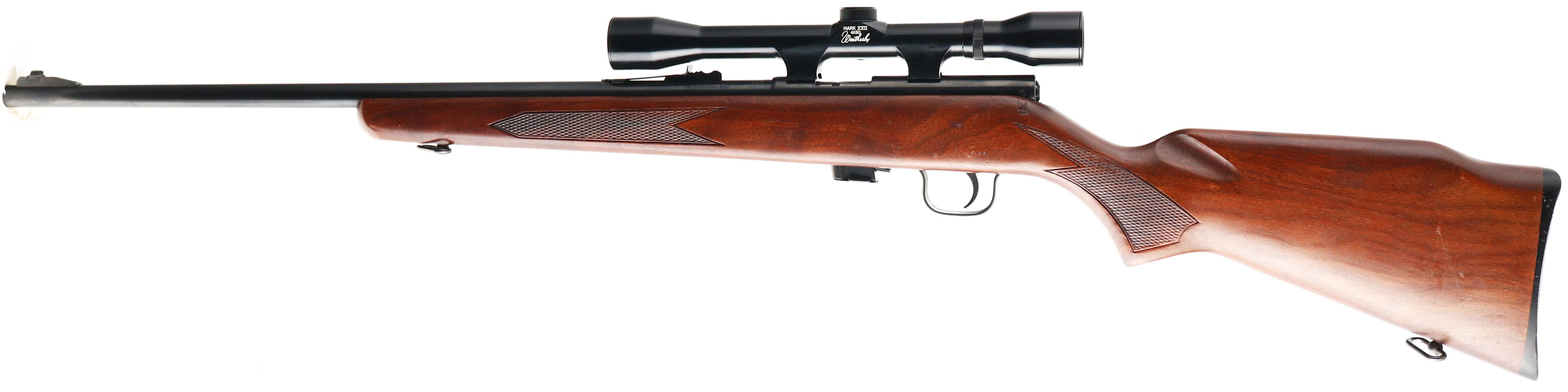 Winchester, Model 320, CAL: 22 S,L,LR, MFG: 1972-74, SN: 38565, Bolt Action Rifle, 22'' barrel. The checkered flat pistol grip wood stock is excellent, with multiple light surface scrapes & contusions. The metal blue finish rates 98% overall. Bore is excellent & bright. The grooved receiver holds a Weatherby Mark XXII 4X50 scope, while the barrel carries factory sights. Buttstock carries a Winchester grooved black plastic buttplate. Detachable magazine. Sling swivels. FFL or C&R Req. - Value: 300 to 500
