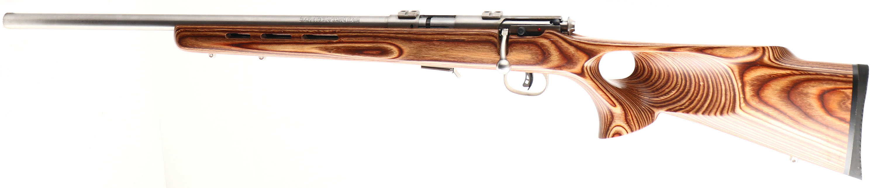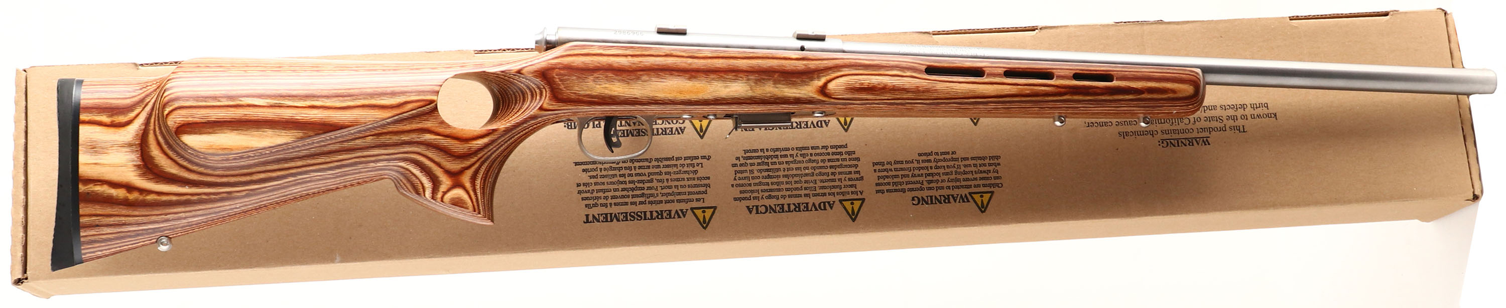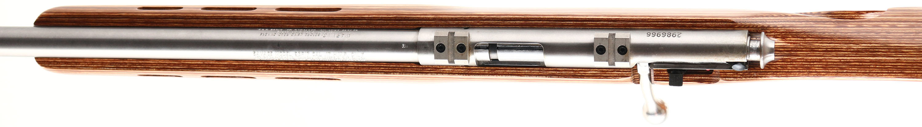 BOXED, Savage, Model 93R17 (LEFT HANDED), CAL: 17HMR, MFG: Modern, SN: 2986966, Bolt Action Rifle, 21 1/4'' barrel. The laminated thumbhole stock with raised cheek & vented forend is excellent. There are minor handling & storage marks to the clear coat finish. The stainless steel finish on the barrel & receiver is excellent. Bore is excellent. The receiver holds factory scope blocks. No open sight provisions. Stock has solid rubber recoil pad. Comes in factory box, with owners manual, extra mag & lock/key. FFL Req. - Value: 250 to 400