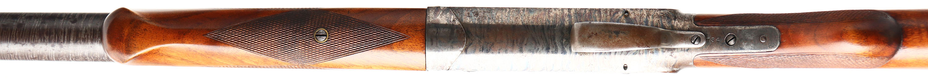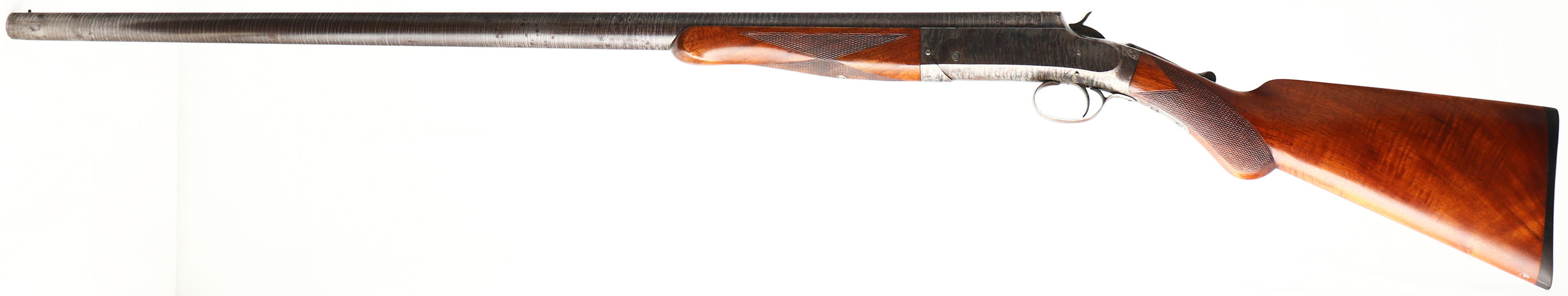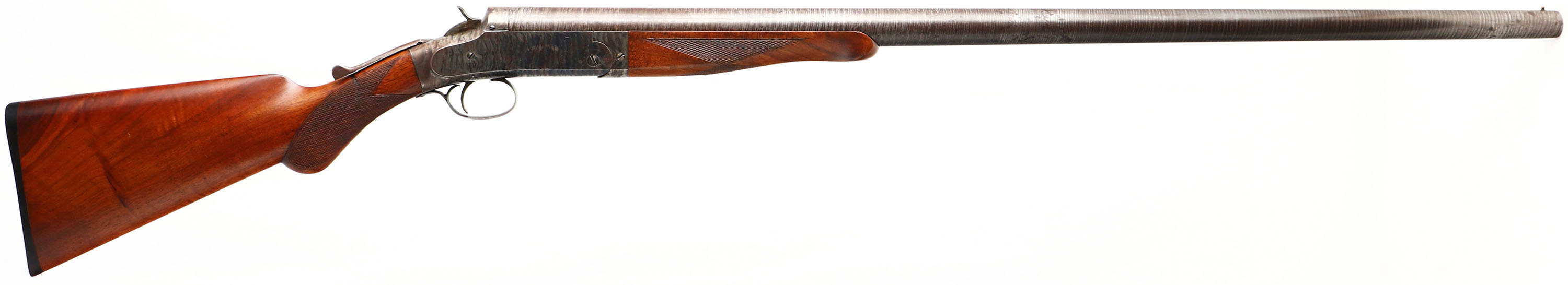 W.H Davenport ?, Single Barrel, CAL: 8GA, MFG: 1896-1906, SN: 0734, Break Action Single Shot Shotgun, 36'' twisted steel barrel. There are no markings on the gun, but we believe it's a W.H Davenport Single Barrel Shotgun. The checkered round knob wood stock & schnabel forend are excellent. There are minor handling marks to the finish. The twisted steel pattern on barrel is prominent. The case-hardened receiver retains visible, but fading case-colors. Bore is excellent, with visible light scratches. The barrel holds a single front bead. Stock has a checkered plastic buttplate. FFL or C&R Req. - Value: 1000 to 3000