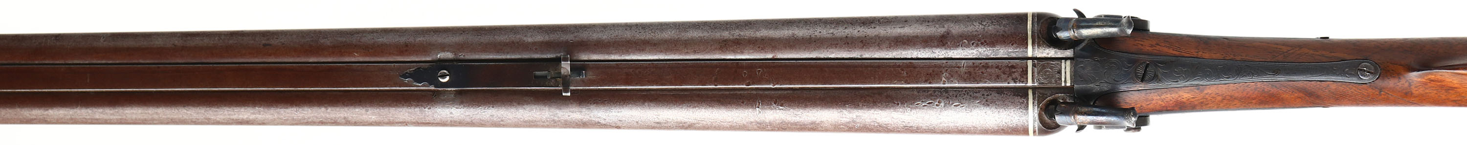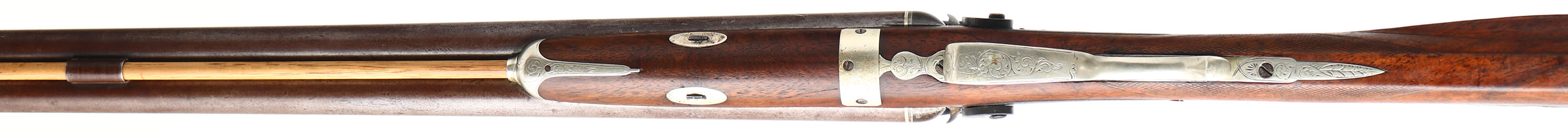 Unknown Mfg, Combo Gun, CAL: 12GA/45cal, MFG: N/A, SN: NVSN, Percussion Muzzleloader Double Barrel Combo Gun, 31 1/4'' barrels. There are no markings on this gun to give any further information. The checkered & beaded cheek straight grip wood stock is excellent. The beaded cheek has a silver inlaid deer & mountain background & the right side of the stock has an engraved trap door compartment for patches. The silver furniture, receiver & hammers all display hand engraved floral/ornamental scroll. The barrels have worn to a mix of metal gray, evenly toned to a brown patina. The chamber end of the barrels have a silver band. The receiver & hammers are blued, rating 90%. The rifled bore is very good, with strong rifling. The shotgun bore is very good, appears grainy. The solid rib holds an adjustable rear sight & a block elevated blade front sight. Stock has a silver crescent metal buttplate. Comes with an authentic horn powder flask. Although we cannot give credit where it is due, the maker of this firearm was a true craftsman and their workmanship lives on. Blackpowder, No FFL Req. - Value: 500 to 2000