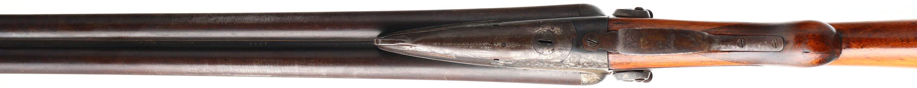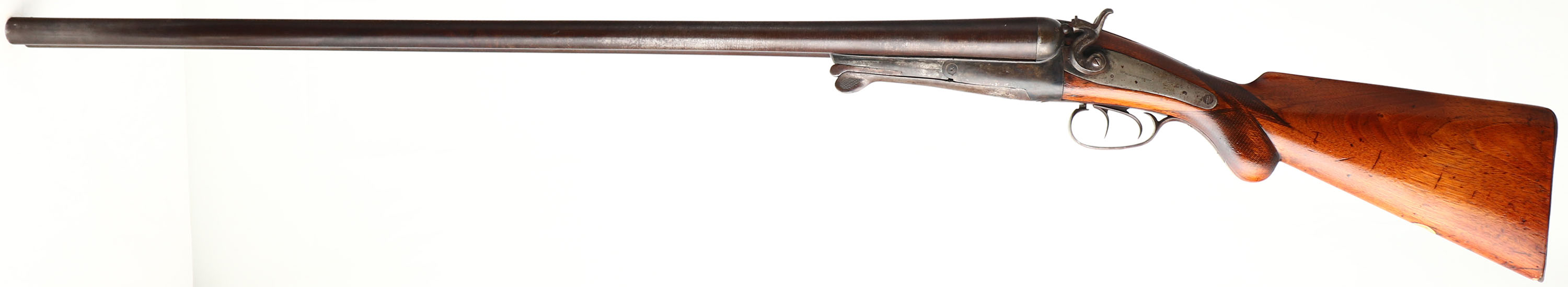 W. & H. Hudson, Underlever Shotgun, CAL: 8 GA, MFG: 1890's, in business 1893-1900's, SN: 3486, Underlever Break Action Shotgun, 35 7/8'' Belgian Fine Laminated Steel barrels. W. & H. Hudson was a Belgian gun manufacturer, who sold these shotguns to various American importers & hardware companies. The original, checkered round knob stock is very good. The stock has been sanded & carries a thick refinish. There is an edge chip at the toe, alongside contusions, scratches & scrapes. The belly of the stock carries a blank initial plate. The laminated steel barrels have toned to a brown patina. The receiver & sideplates have worn mostly gun metal gray, with spotty brown patina. The solid rib is stamped ''Belgian Fine Laminated Steel''. Bores are very good, with intermittent roughness & striations, but could be cleaned & polished. The solid rib holds a single bead. Stock carries a smooth metal widow's peak buttplate. Notice: Twisted barrels are not safe to shoot smokeless powder or steel shot out of. LOP: 13 5/8''. Antique, No FFL Req. - Value: 1000 to 2500