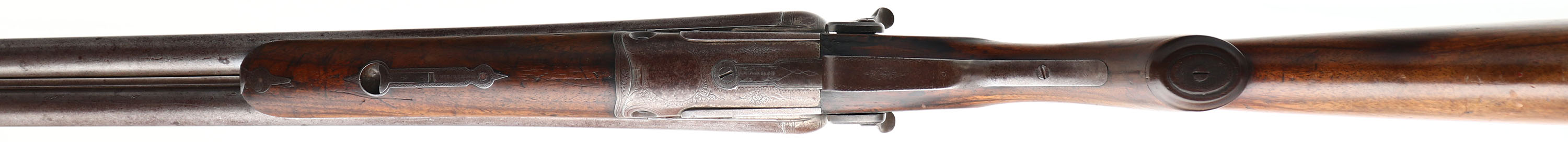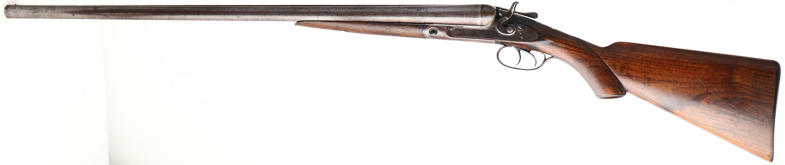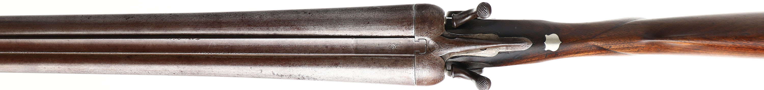 Parker Bros, D2 Grade, CAL: 10 GA, MFG: 1884-85, Antique, SN: 40141, Break Action SxS Shotgun, 30'' Damascus barrels. The solid rib is marked ''PARKER BRO MAKERS. MERIDIAN CONN. DAMASCUS STEEL''. The right flat of the floor plate is marked with a two line patent date & the left flat is marked ''2'' over the full SN & patent date. The left barrel flat is marked with a two line patent date & the full matching SN can be found on the forend, which still retains case-colors. ''PARKER BROS'' can be seen on the top of both lock plates. The American walnut checkered, capped pistol grip stocks are very good & solid. The checkering is smooth, alongside dings, scratches & scrapes. The stock has been lightly sanded, with protective oils added over time. There is a blank silver shield initial plate behind the tang The thumbprint Damascus finish on the barrels is still prominent, worn to a mix of metal gray & brown patina. The receiver, trigger guard, break lever, hammers & side plates have all fully toned to a brown patina. The left sidelock displays quail game scene & the right has a flying duck game scene. There a circle vignette with an engraving that's been worn smooth. The game scenes are accompanied by ornamental scroll on the receiver, side plates, break lever, hammers, trigger guard & forend metal components. Bores are good, consistently rough with light pitting. Solid rib holds a single front bead. Stock has a worn Parker hard rubber dogs head buttplate. Antique, No FFL Req. - Value: 1000 to 2000