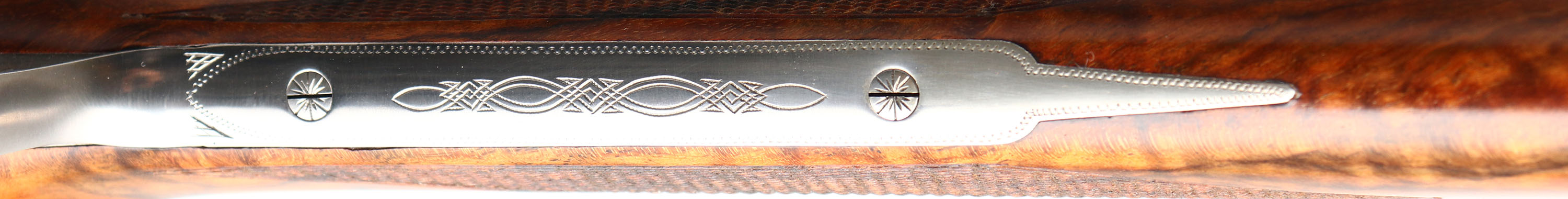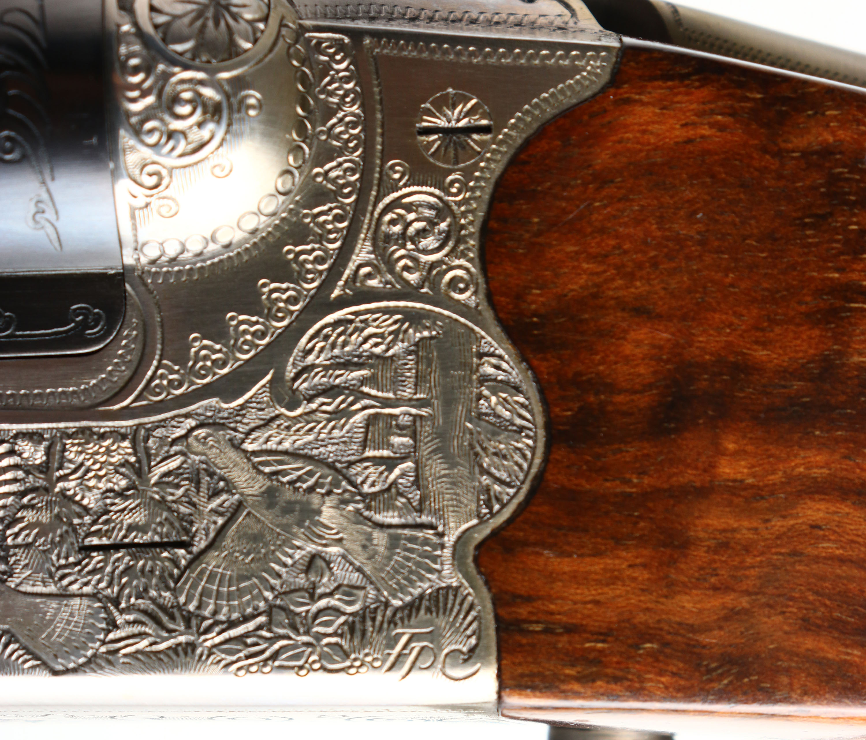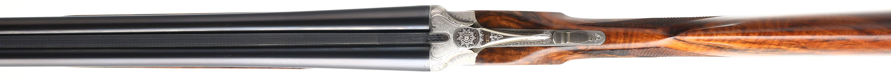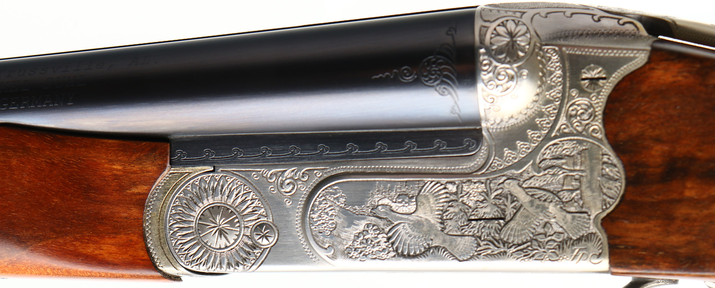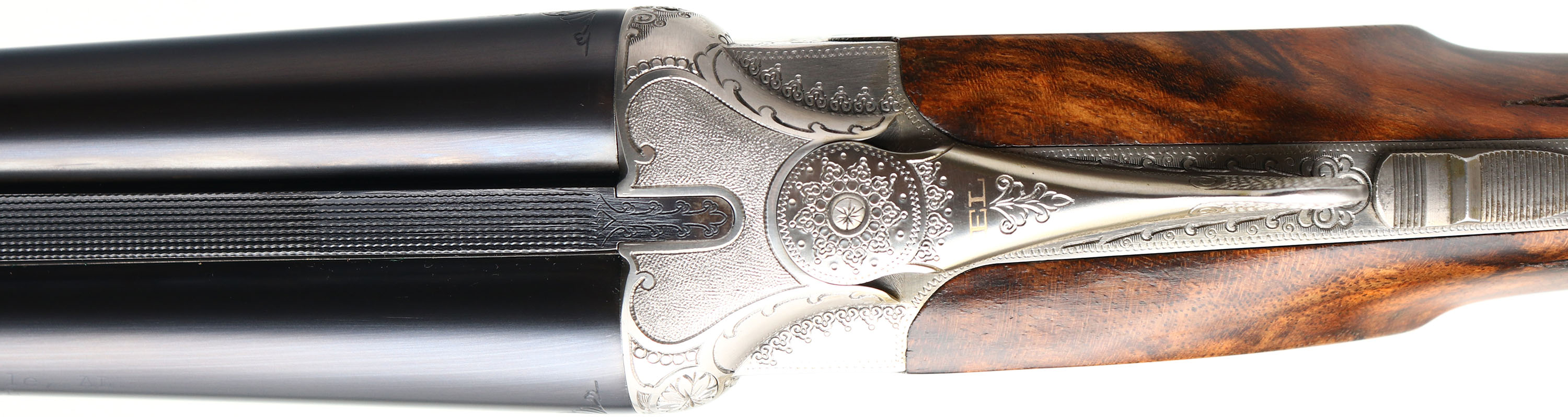 FABULOUS & BOXED, Merkel, Model 280 EL ( DF Model 41E), CAL: 28 GA, MFG: 1975, SN: 387100, Break Action SxS Shotgun, 28'' barrels. The left barrel is marked in three lines ''MERKEL USA INC TRUSSVILLE, AL.'', ''GEBR. MERKEL SUHL'', ''MADE IN GERMANY''. The right barrel is marked ''280 EL'' & ''28 GA''. The bottom of the receiver is marked in gold lettering ''MERKEL CUSTOM'', & ''28 BORE'', over the Suhl trademark logo. The top of the break lever is marked ''EL'', also in gold lettering. ''FP'' engraver initials on lower left corner of receiver. The original checkered straight grip wood stock is excellent. The grain pattern & wood figure is noteworthy & attractive. There is a blank gold oval nameplate on the belly. The metal blue finish on the barrels rates 99% overall. The polished coin silver receiver, trigger guard & break lever are all excellent. The receiver displays bird game scenes on both sides, accompanied by intricate ornamental scroll work on the break lever, trigger guard, forend metal components, screws & barrel rib end. Bores are excellent, with a few visible striations. The solid, matted rib holds a single gold tone bead. Checkered butt. Comes with factory SN matching box, with original packaging. Box condition is excellent. FFL Req. - Value: 6000 to 10000
