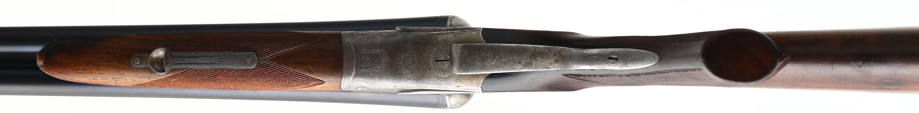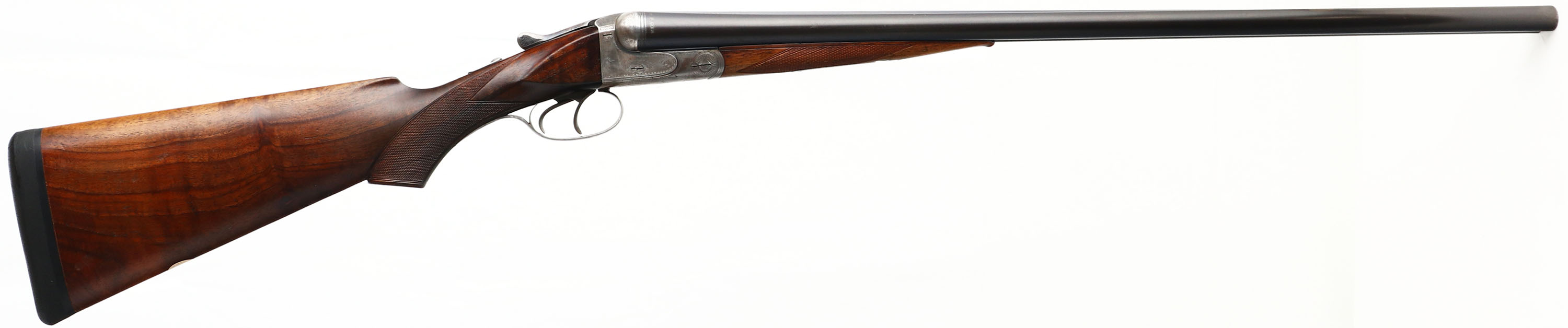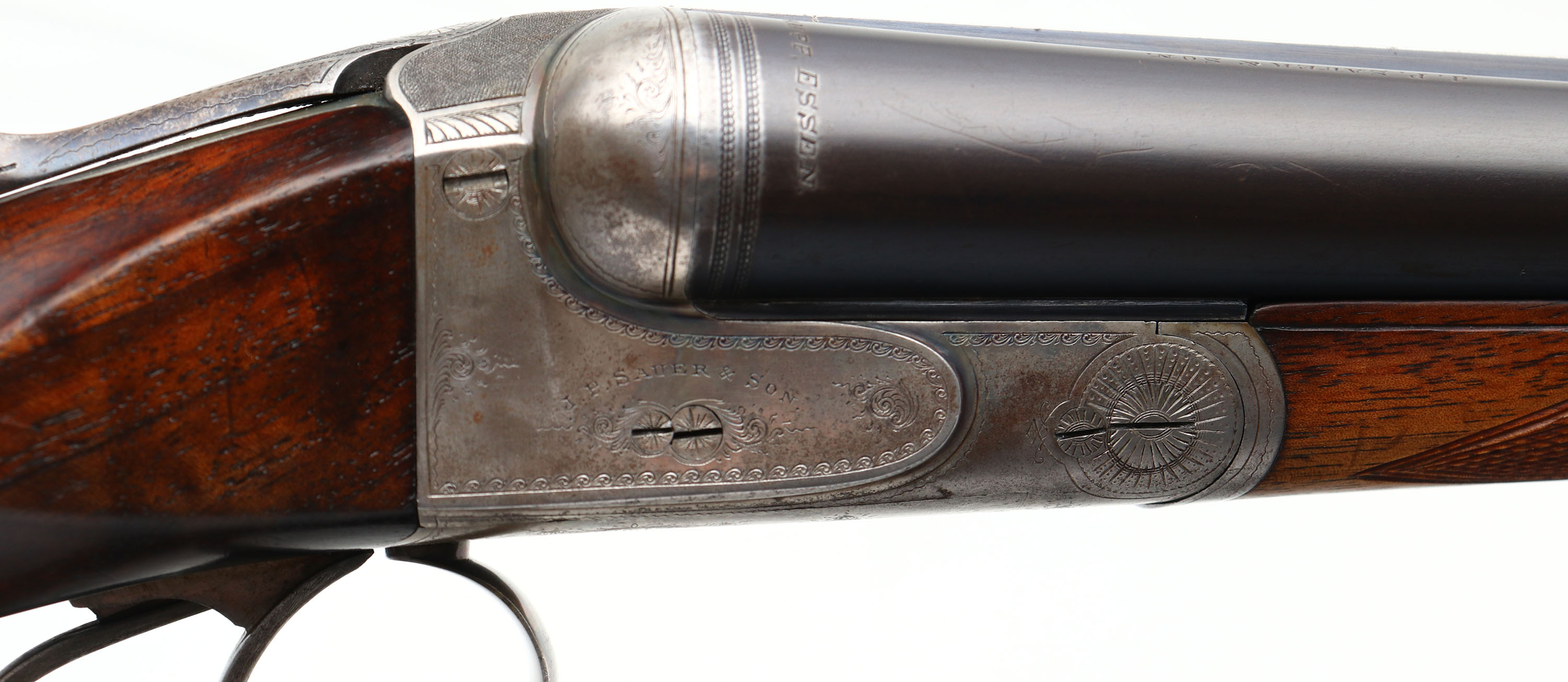 J.P Sauer & Son, Hammerless Shotgun, CAL: 12 GA, MFG: 1906, SN: 117065, Break Action SxS Shotgun, 28'' barrel. Both barrels are marked ''J.P SAUER & SON'' & ''KRUPP ESSEN'' near the chamber. Both sides of the receiver are marked ''J.P. SAUER & SON'', over the screws. Matching SN's can be found on the lower tang, floor plate, left barrel & a partial matching SN is on the forend. Floor plate & left barrel are marked ''MADE IN PRUSSIA''. The checkered flat pistol grip stocks are very good, having been lightly sanded & refinished. There are smoothed contusions, nicks & dings. The forend has a small edge chip repair at the tip. The checkering has been retraced & is sharp. There is an inlaid blank oval silver nameplate on the belly of the stock. The original metal blue finish on the barrels rates 85%, with areas wearing thin, toned to a thin brown patina. The case-hardened receiver has mostly worn to a mix of metal gray & brown patina, with remnants of case-colors in protected areas. Intricate ornamental scroll engraving on the receiver, break lever, trigger guard, forend metal components, screws & barrel rib end. Bores are excellent. The solid matted rib holds a single front bead. Stock has a Decelerator solid black rubber recoil pad. A partially restored quality German shotgun from the early 1900's. FFL or C&R Req. - Value: 1500 to 3000