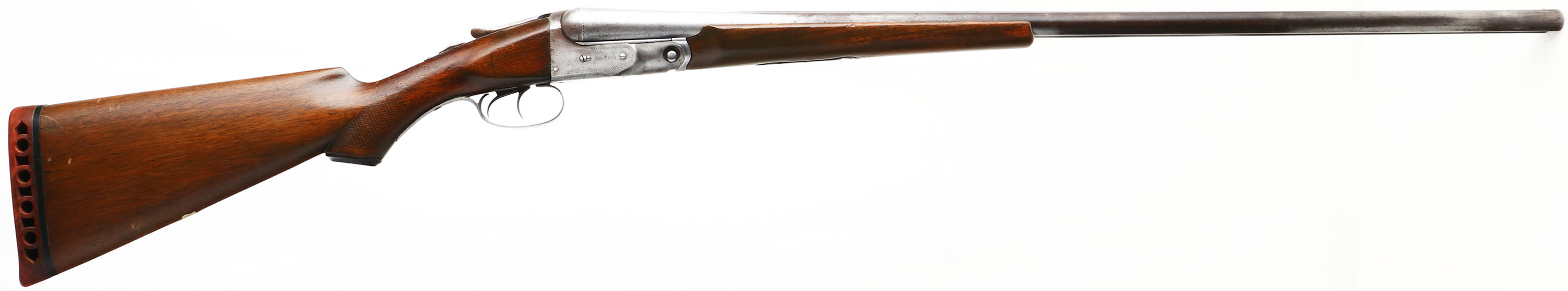 Parker Bros, VH Grade, CAL: 16 GA, MFG: 1910, SN:154917, Break Action SxS Shotgun, 32'' barrels. Extractor, Full/Mod, 1 1/2 Frame, The checkered, capped pistol grip stock & beavertail forend are very good, having been sanded & refinished. There are minor contusions & scrapes, with a few minor cracks; one next to the receiver, one next to the trigger guard, one at the comb & one on the left side of the stock. There is filler where the widows peak part of the buttplate was. The metal finish on the barrels has worn to a mix of metal gray & brown patina, with remnants of blue in the barrel creases. The receiver has worn to mostly metal gray, with spotting toned to brown patina. Bores are excellent. The solid, matted rib holds a single front bead. Stock has a Ranger, ventilated red rubber recoil pad. FFL or C&R Req. - Value: 300 to 600