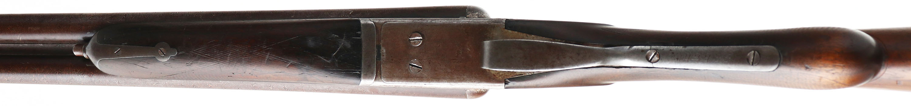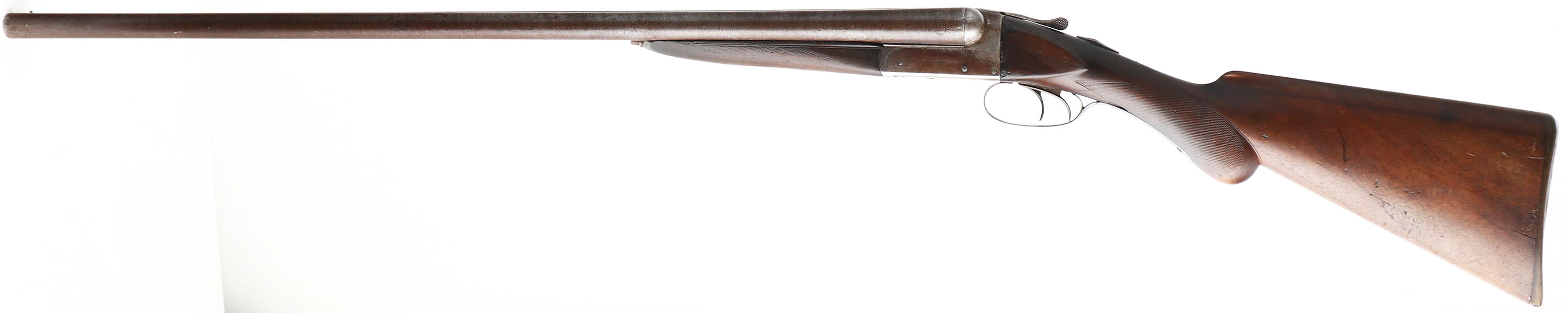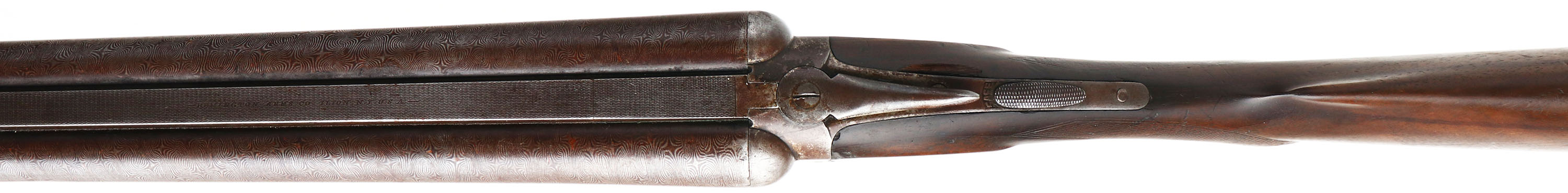 Remington, Model 1894 A Grade, CAL: 12 GA, MFG: 1894-95, Antique, SN: 102935, Break Action SxS Shotgun, 30'' Damascus barrels. The checkered round knob wood stock & forend are good, having been sanded & refinished. There are multiple small cracks, edge chips, nicks & dings. The checkering is worn smooth. The fingerprint Damascus finish on the barrels is prominent, fully toned to a chocolate brown patina. The receiver has worn to a mix of metal gray & brown patina. Bores are good, with roughness & intermittent pitting. The solid, matted rib holds a single front bead. Stock carries a worn RA checkered buttplate. There is an issue with the break action, it's tough to get all the way open & there's a significant ''click'' when it reaching the fully opened position. This gun need to be evaluated by a licensed gunsmith before use. Antique, No FFL Req. - Value: 200 to 400