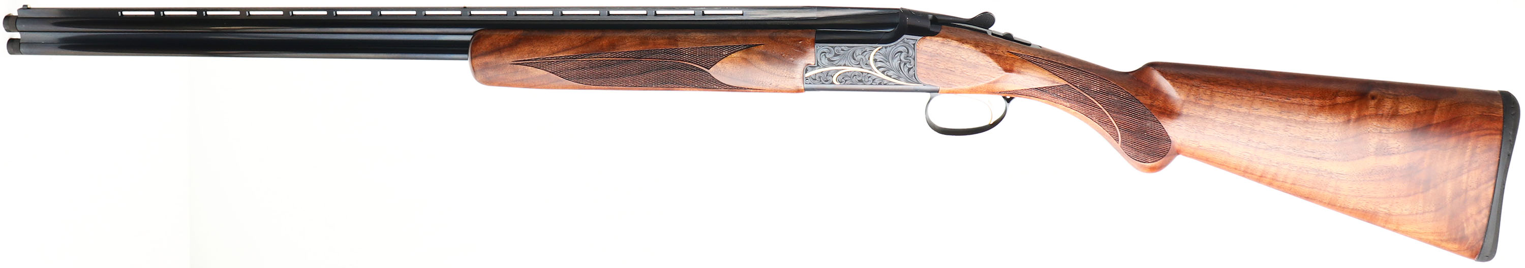 BOXED Browning, Citori Gran Lightning, CAL: 410 GA, MFG: Modern, SN: 35129ZN131, Break Action O/U Shotgun, 28'' barrels with ventilated rib. The checkered round knob wood stocks are excellent. There are contusions, scrapes & dings to the original finish. The metal blue finish rates 98% overall. The receiver has floral/ornamental scroll engravings with gold accents. Bores are excellent. The ventilated rib holds a small mid rib & front ivory beads. Stock has an Inflex solid black rubber recoil pad. Comes in factory SN matching box, empty accessory box, with related paperwork, IC choke, trigger lock & snap caps. Box condition is excellent, with tape & a spot where a sticker was ripped off. FFL Req. - Value: 2500 to 3500