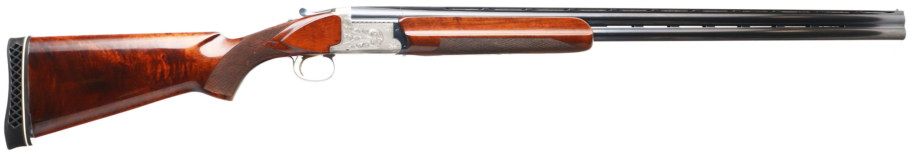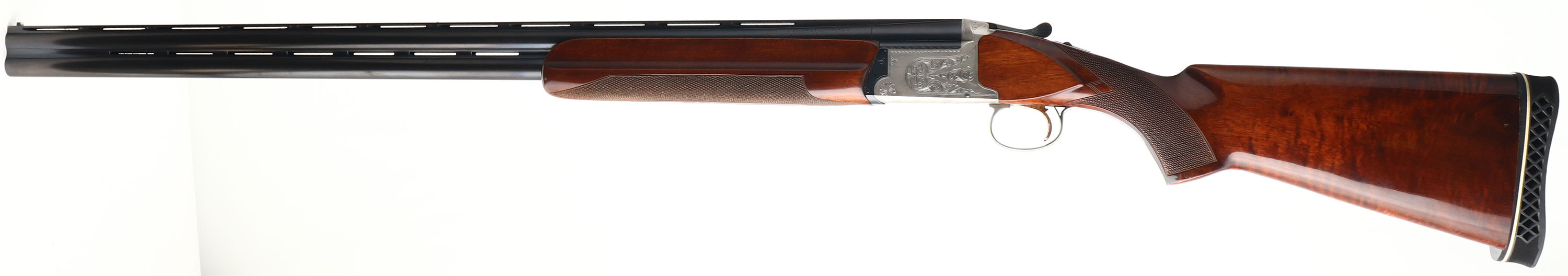 Nikko (Japan), Model 5000-II, CAL: 12 GA, MFG: 1975-95, SN: 614886, Break Action O/U Shotgun, Choke: F/F+, 32'' double ventilated barrels. The checkered flat pistol grip stocks are excellent. There are minor handling marks, scrapes & scratches to the factory high gloss finish. The metal blue finish on the barrels rates 95% & the coin silver receiver is excellent. The receiver displays simple, yet elegant ornamental engraving. There are accent engravings on the break lever, safety switch, trigger guard & forend metal components. Bores are excellent. The ventilated rib holds a small mid-rib ivory bead & front ivory bead. Stock has an adjustable ventilated recoil pad that's slightly turned. Gold tone trigger. A quality produced O/U shotgun for trap or skeet shooting. FFL Req. - Value: 600 to 1000