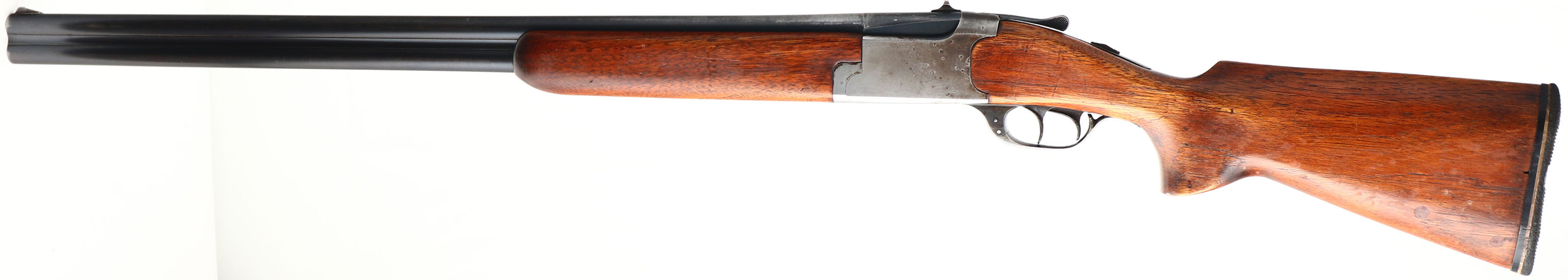 Ranger, Model 103-1, CAL: 12 GA, MFG: 1930's, SN: 2775, Break Action O/U Shotgun, 30'' barrels. The flat pistol grip & cheeked wood stocks are good, having been repaired, sanded & refinished. The belly of the stock split & has two screws/bolts holding it together. There are other contusions, scrapes & dings. The metal blue finish on the barrels rates 70%, with consistent thinning, worn to metal gray & thin brown patina. The receiver has worn to a mix of metal gray & brown patina. Bores are excellent, with visible striations. The barrel has a rear peep sight & blade front sight. Stock has a grooved black rubber buttplate that's worn. The Marlin Model 90, sold to Sears Roebuck were marked Ranger with a specific designation for each of the different gauges. The first Ranger's came out in 1936, and after WW II, (1945) the name was changed to J.C. Higgins. FFL or C&R Req. - Value: 200 to 400
