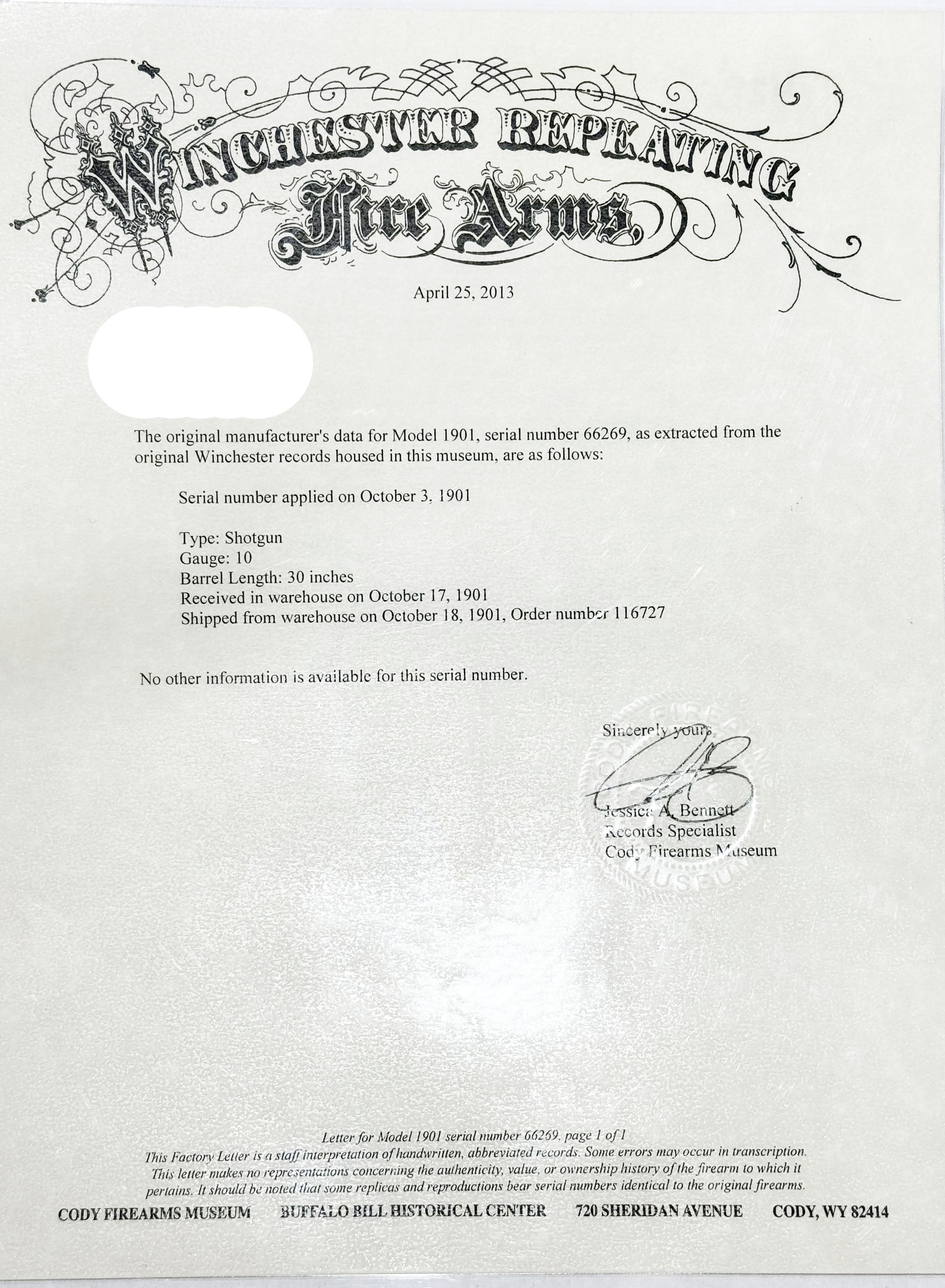Winchester, Model 1901, 10 GA., MFG. 1901 (FIRST YEAR PRODUCTION), SN: 66269, Lever action, Full Choke, 30'', These shotguns were serial numbered as a continuation of the 1887 & ended with SN 67428 in 1901, making this an early first year production gun. The original round knob pistol grip stocks are very good, with numerous small scratches, dings & gouges. They carry the original finish. There is a 1'' chip at the toe pf the stock. Metal blue finish has thinned mostly gray, with the remaining finish toning to a brown patina & some original blue remaining on the lever & in more protected areas. Metal also shows some pitting, scarring & areas of cleaned corrosion, mostly on the barrel. Original checkered metal buttplate. Bore is good, with some light pitting. Comes with a Cody Winchester Factory Records Letter confirming configuration & dates. A good original example or would make a great cowboy action gun. FFL or C&R Req. - Value: 1000 to 2000