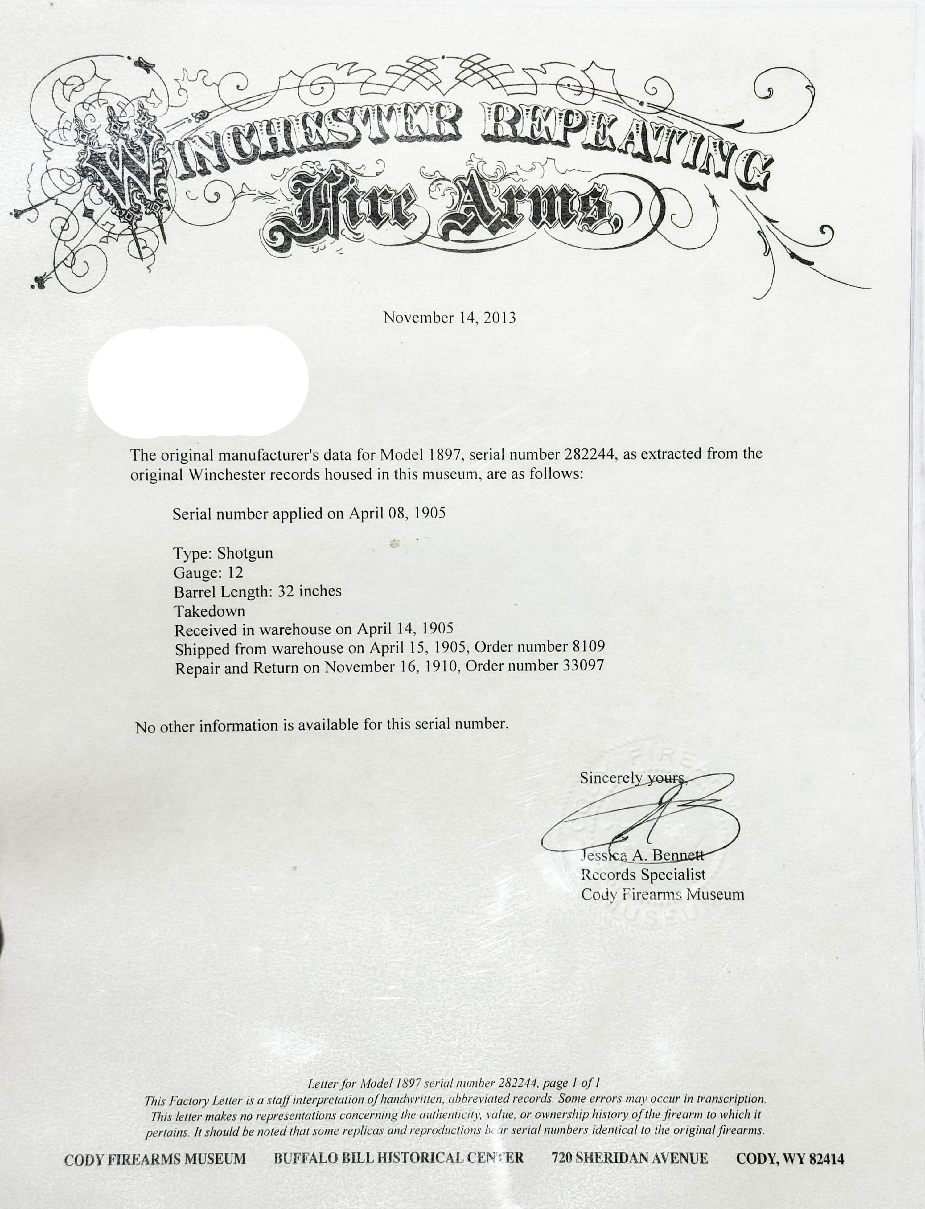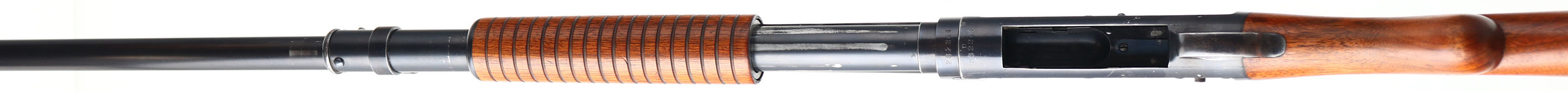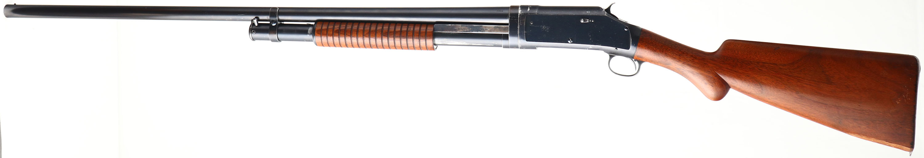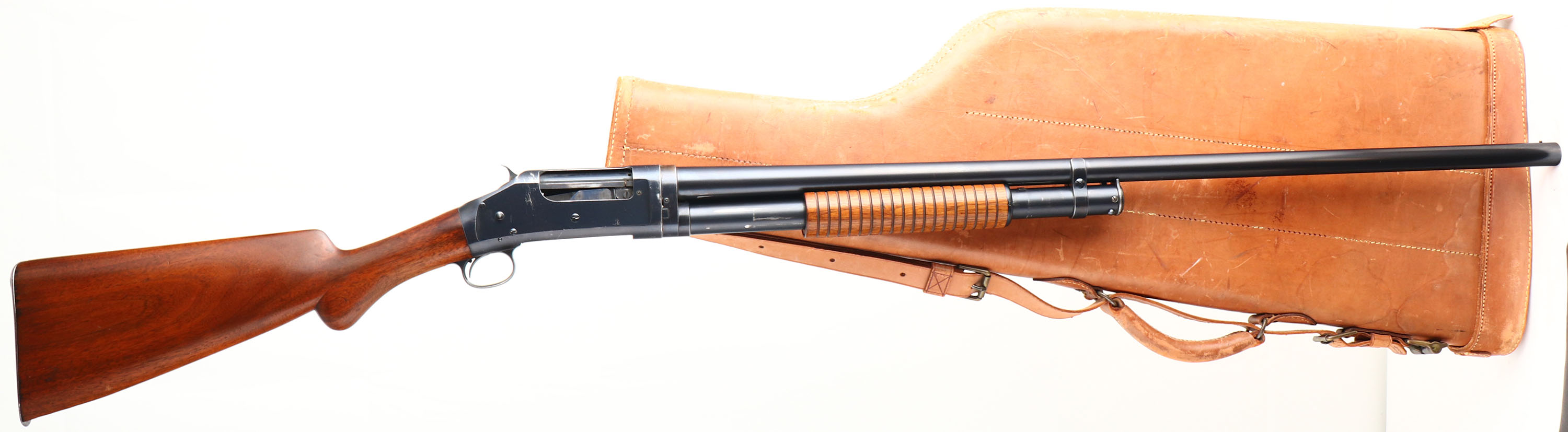 RARE Winchester, Model 1897 FACTORY CASED TWO BARREL SET, 12 Ga., MFG. 1905, SN: 282244, Take-down, second variation, Two barrel Pump Action Shotgun, 32'' Full & 24'' Cyl barrels, with SN's matching. Standard length barrels were 30'' Field & 26'' Bush, so these two 32'' & 24'' barrels were special order. The original round knob pistol grip wood stocks are excellent & solid, however the toe has a large 3'' missing toe break. The stocks show very few minor scratches, or contusions to the excellent original finish. The original metal blue finishes rate, 95% on both barrels, 90% on the receiver. Bores are excellent, bright & shiny. Single front beads. Stock carries a Winchester widow's peak checkered metal buttplate. Shotgun & barrels come stored in the original two barrel mutton leg leather carry case, which is stamped on one of the leather straps ''97'', ''24'', & ''32''. Unfortunately, the seam around part of the lid & the hinge have come unstitched & need repair. Also comes with a three piece wood cleaning rod. Comes with a Cody Winchester Factory Records Letter confirming configuration & dates. This is a very nice special order set, with case & letter. FFL or C&R Req. - Value: 1000 to 2000