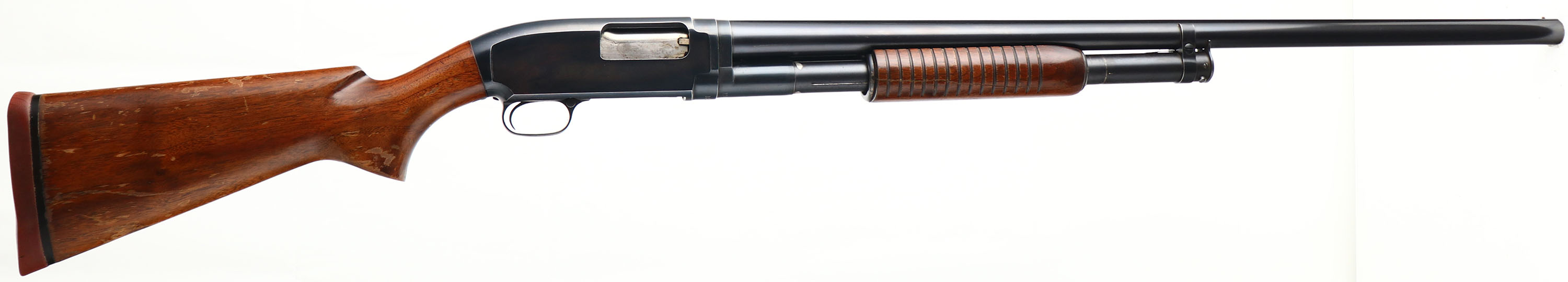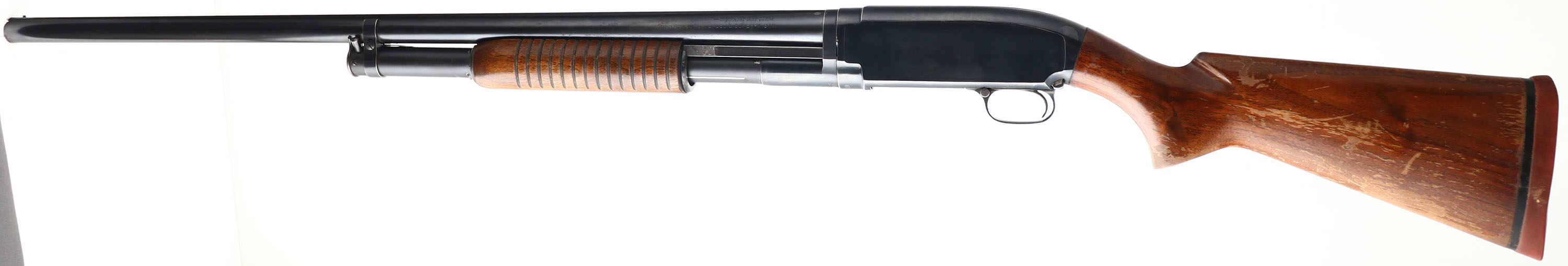 Winchester, Model 12, CAL: 12 GA, MFG: 1953, SN: 1553849, Pump Action Shotgun, Choke: FULL, 3'' Chamber, 30'' Solid rib barrel. The original flat pistol grip wood stock is very good, while & corncob forend fair & solid despite glue repaired full length cracks on the right side & bottom. The stocks display lots of flaking, minor scrapes, scratches & contusions to the original finish. The original metal blue finish remains at 80% overall. Bore is excellent. Single front bead. Safety is stuck on fire & needs adjustment or repair. Buttstock carries a Winchester solid recoil pad, with 13 5/8'' LOP. FFL or C&R Req. - Value: 300 to 600