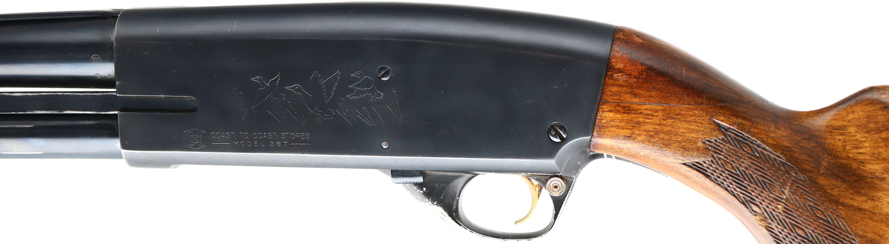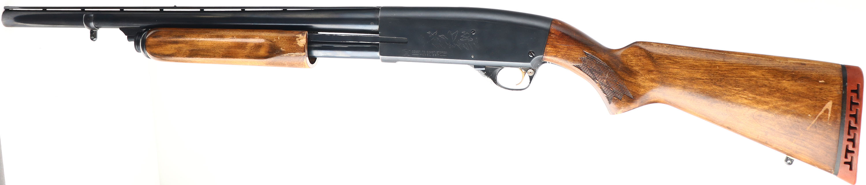 Coast to Coast, Model 367, CAL: 12 GA, MFG: 1960's, SN: 583.200, Pump Action Shotgun, 3'' chamber, Choke: IC+, 19 1/2'' cutoff barrel. Made for Coast to Coast by Savage as a copy of their own Model 30. The original flat pistol grip wood stock & finger grooved forearm are good & solid, despite a large glue repair at the top of wrist behind the receiver. The stocks display an added layer of finish over the original finish. There are small surface scrapes, scratches & contusions, along with some flaking of the original finish under the current finish. The original metal blue finishes rate 90% overall, with numerous scrapes on the Japan black on the trigger guard to about 50%. Bore is excellent. The barrel holds a single mid bead with no front bead. Buttstock carries a period recoil pad. Sling studs. This would make great short barrel home defense pump action shotgun. FFL or C&R Req. - Value: 150 to 300