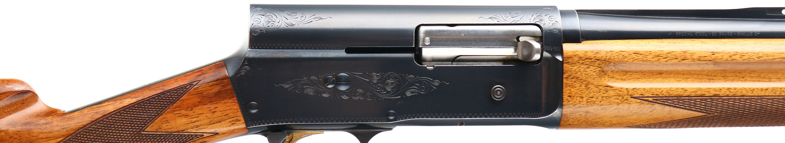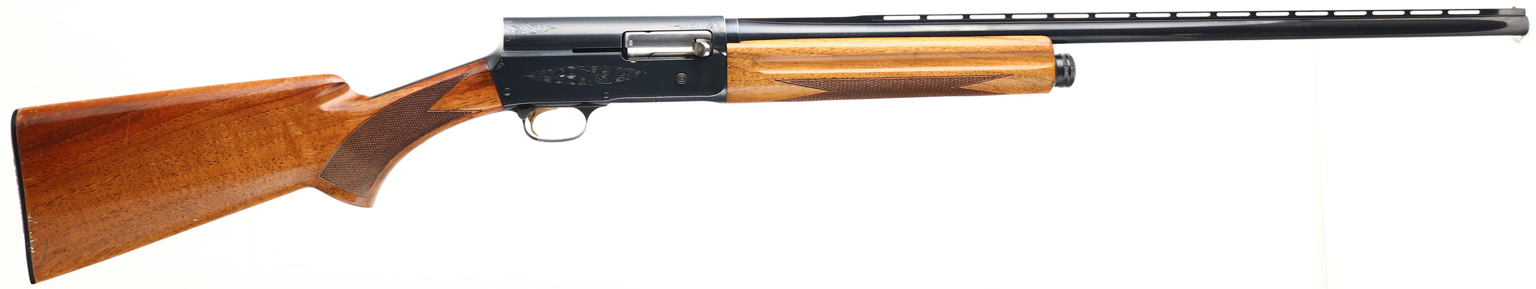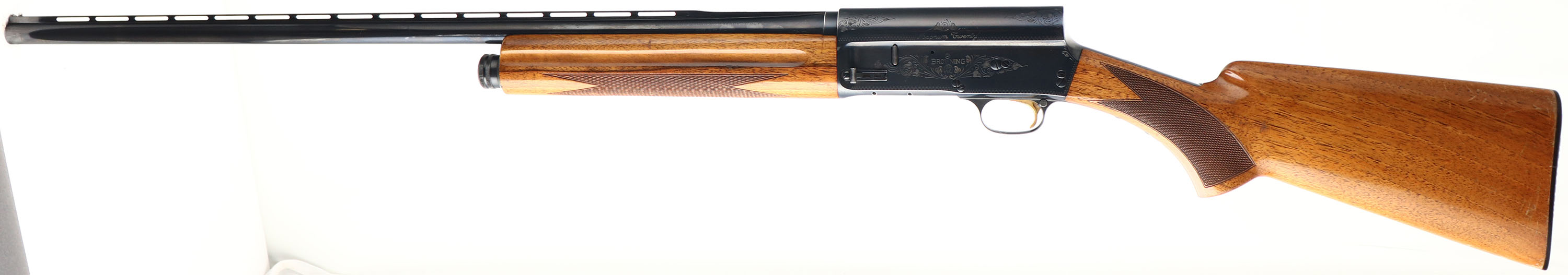 Browning, Model A-5 MAGNUM TWENTY, 20 GA., MFG. 1969, SN: 69X-23355, made in Belgium, Semi-Auto Shotgun, 3'', Full choke, 27 1/2'' Matted vent rib Special Steel barrel, Barrel marked ''X20743''. The original high gloss finish, checkered, flat knob pistol grip wood stocks are excellent, with several finish level scratches & minor contusions mostly to the stock. The original metal blue finish is 95% on the barrel & engraved receiver. Bore is excellent. FN Browning factory buttplate. Single front bead. Gold trigger. 14'' LOP. High condition & collectible, Belgium made magnum. FFL Req. - Value: 800 to 1500