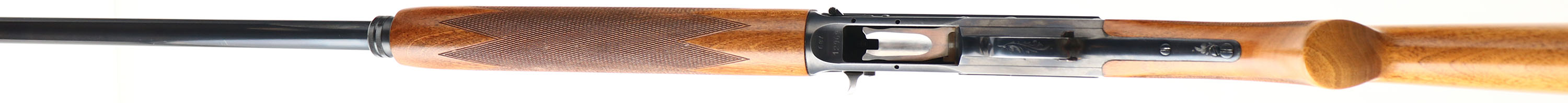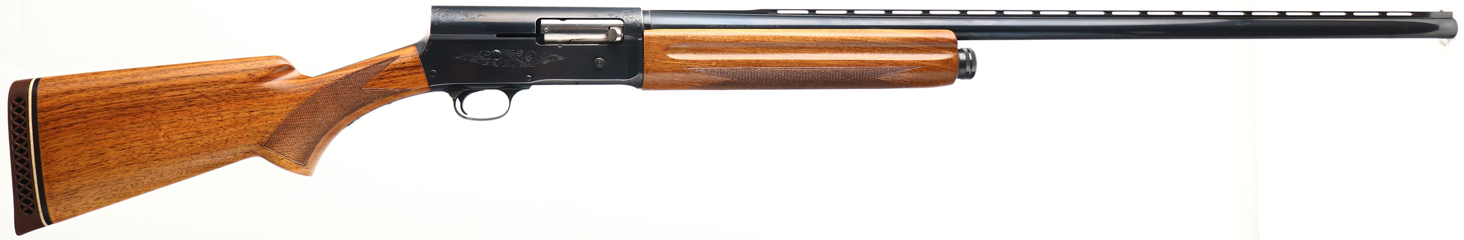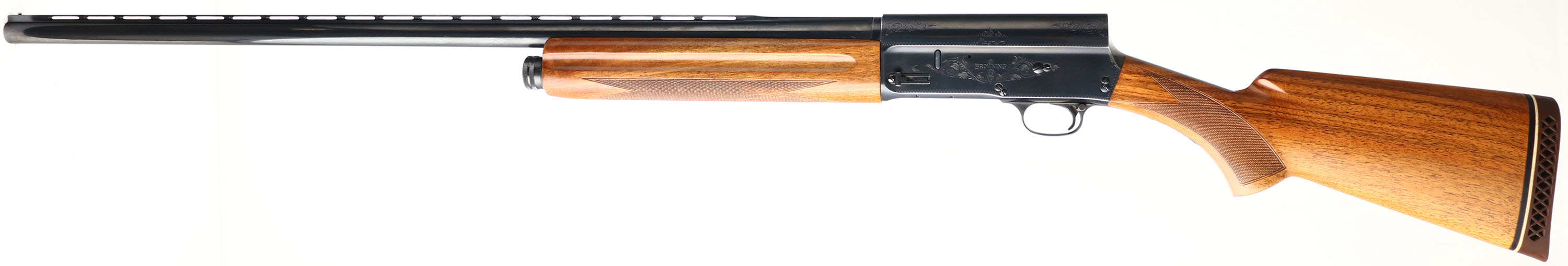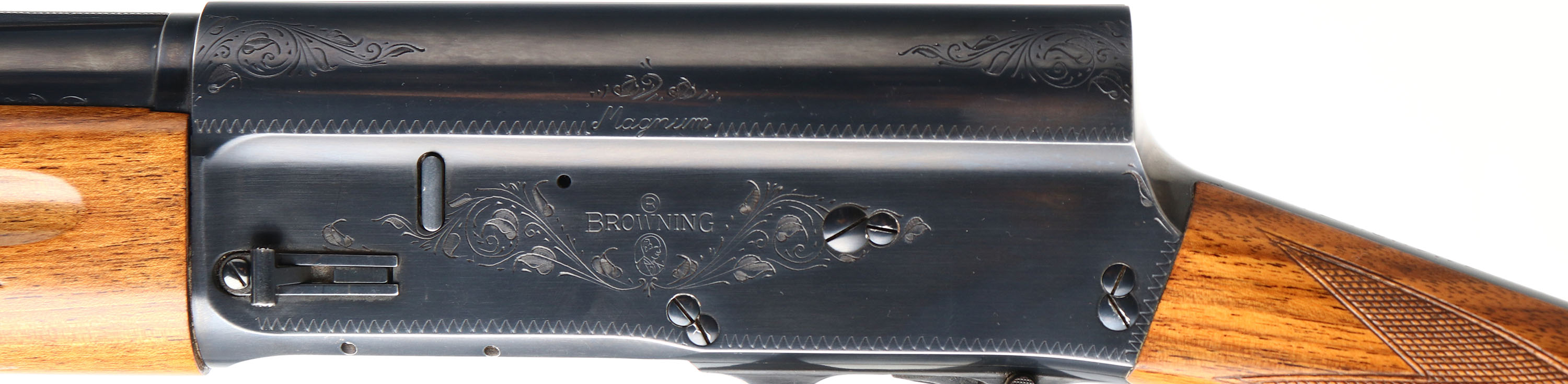 Browning, Model A5 Magnum Twelve, CAL: 12 GA, MFG: 1968, SN: 68V12969, Semi Auto Shotgun, 3'' chamber, 31 1/2'' Ventilated barrel. The original checkered flat pistol grip wood stocks are excellent, as professionally restored. There are virtually no remaining handling marks to the excellent finish. The original metal blue finish rates 95% overall. The receiver displays simple scroll, vine & border engravings. Bore is excellent. The ventilated rib holds a single front bead. Buttstock carries a Browning a ventilated recoil pad. 14'' LOP over pad. An excellent condition overall magnum. FFL Req. - Value: 500 to 1000