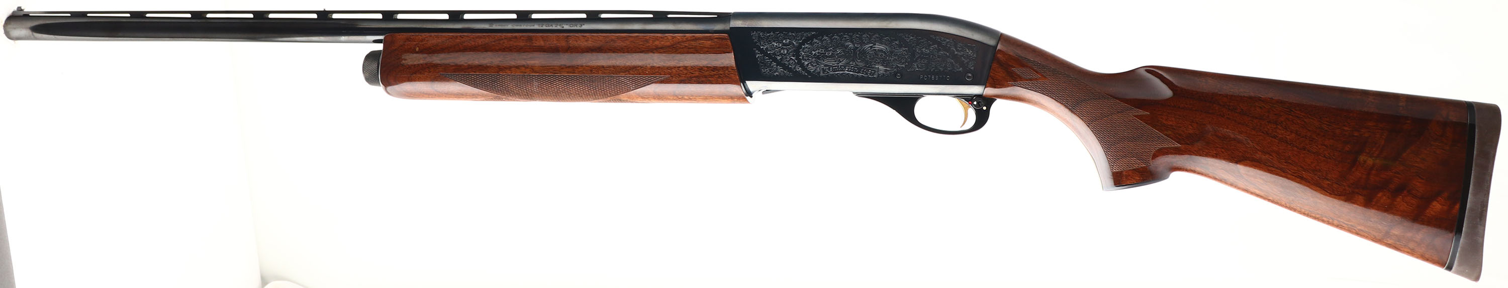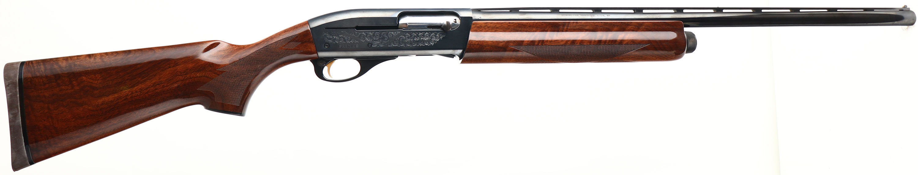 Remington, Model 11-87 Premier, CAL: 12 GA, MFG:1973, SN: PC769770, Semi Auto Shotgun, Choke: Tubes, 2 3/4 & 3'' Chamber, 25 1/2'' Ventilated rib barrel. The original checkered & capped pistol grip wood stocks are excellent, displaying almost no tiny handling marks to the original finish. The original metal blue finish rates 99% overall. Bore is excellent & bright. The rib holds a small mid & front white bead. Buttstock carries a Remington solid recoil pad. LOP 14'' over pad. Comes with four additional choke tubes. An excellent original condition shotgun. FFL Req. - Value: 600 to 1200