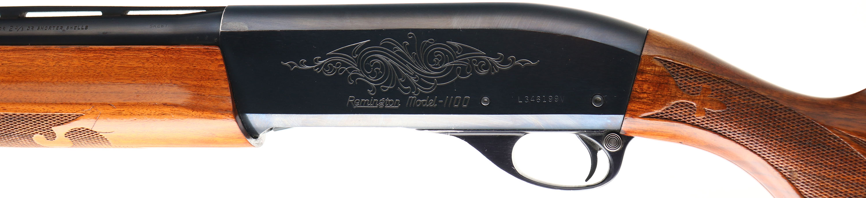 Remington, Model 1100, CAL: 12 GA, MFG: Modern, SN: L346199V, Semi Auto Shotgun, Choke: Skeet, 2 3/4'' Chamber, 25 5/8'' Ventilated rib barrel. The original checkered & capped pistol grip wood stocks are excellent, but with small handling marks, flaking & haze to the original finish. The metal blue finish rates 95% overall, Bore is excellent. The rib holds a single front white bead. Buttstock carries a Remington buttplate. LOP 14''. A very nice original condition 12 ga shotgun. FFL Req. - Value: 400 to 800