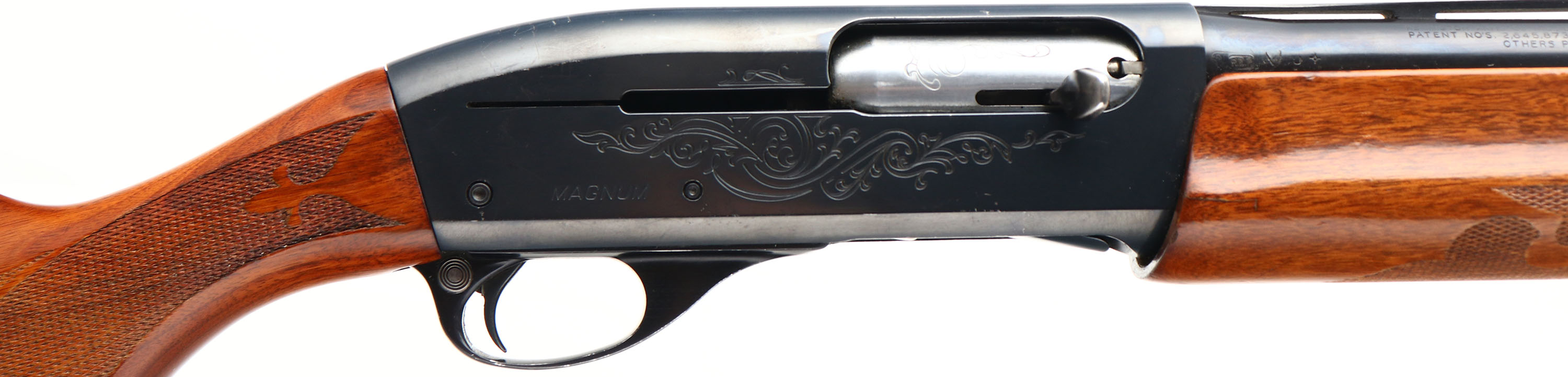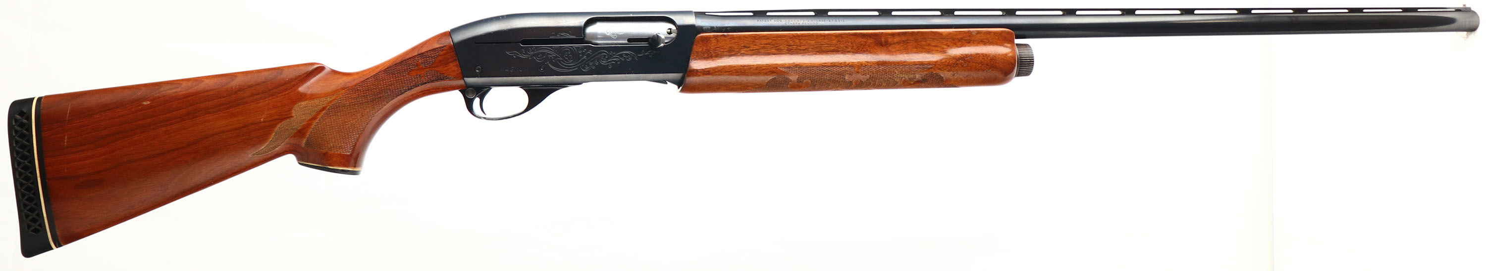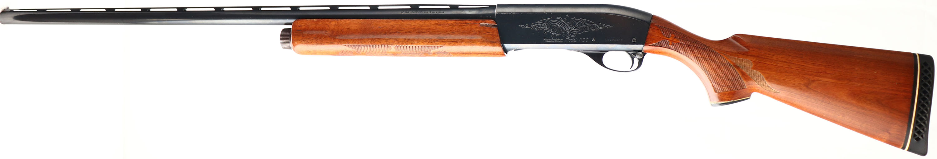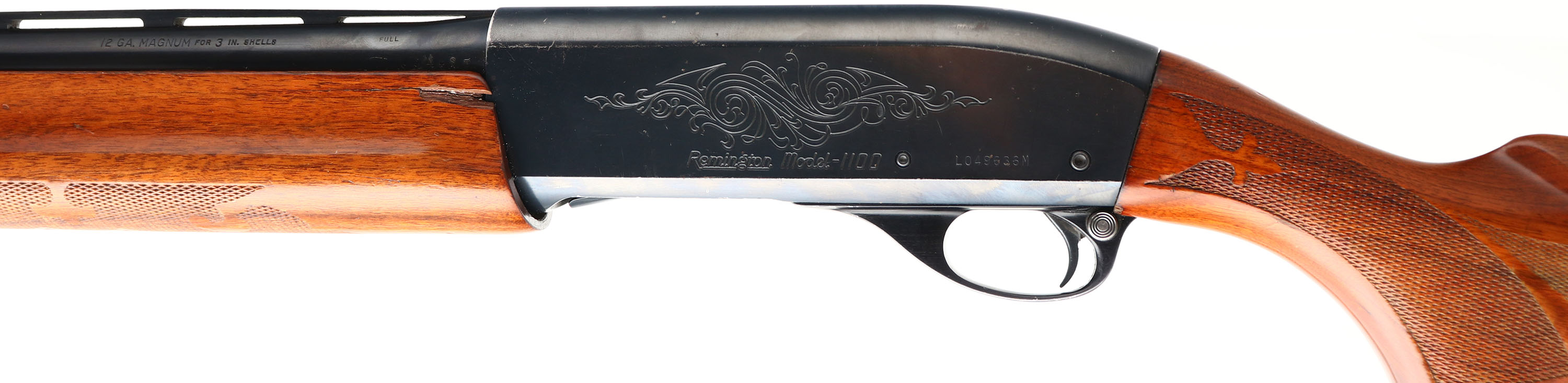 Remington, Model 1100 MAGNUM, CAL: 12 GA, MFG: Modern, SN: L049636M, Semi Auto Shotgun, Choke: Full, 3'' Chamber, 30'' Ventilated rib barrel. The original checkered & capped pistol grip wood stocks are very good, displaying small handling marks to the original finish. There is a 1/4''X1'' chunk of wood missing from the left side of the forend that leads to an additional 2'' crack. The metal blue finish rates 95% on barrel, 90 on receiver. Bore is excellent & bright. The rib holds a single front silver bead. Buttstock carries a Remington ventilated recoil pad. LOP 13 7/8'' over pad. A nice original condition magnum shotgun. FFL Req. - Value: 300 to 600