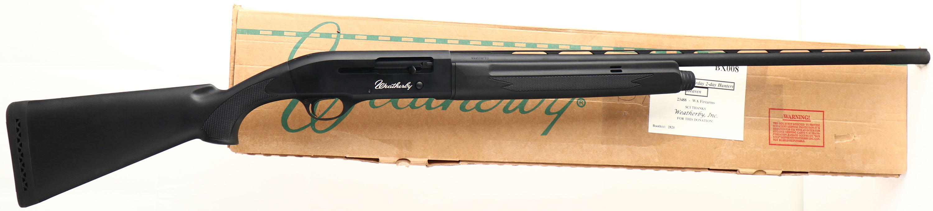 BOXED Weatherby Model SA-08, CAL: 20 GA, MFG: Mod, SN:AE00150, Semi Auto Shotgun, Choke: tubes, 28'' Ventilated rib barrel. The original checkered & flat pistol grip synthetic stocks are excellent, virtually no defects. The metal blue finish rates 99%+ overall on the barrel & receiver. The receiver carries the Weatherby name on both sides'. Bore is excellent. The ventilated rib holds a single front bead. Buttstock carries a Weatherby, ventilated recoil pad. Comes in the original box, with extra tubes, instruction manual, tool, lock & key. LOP: 14'' overpad. FFL Req. - Value: 300 to 500