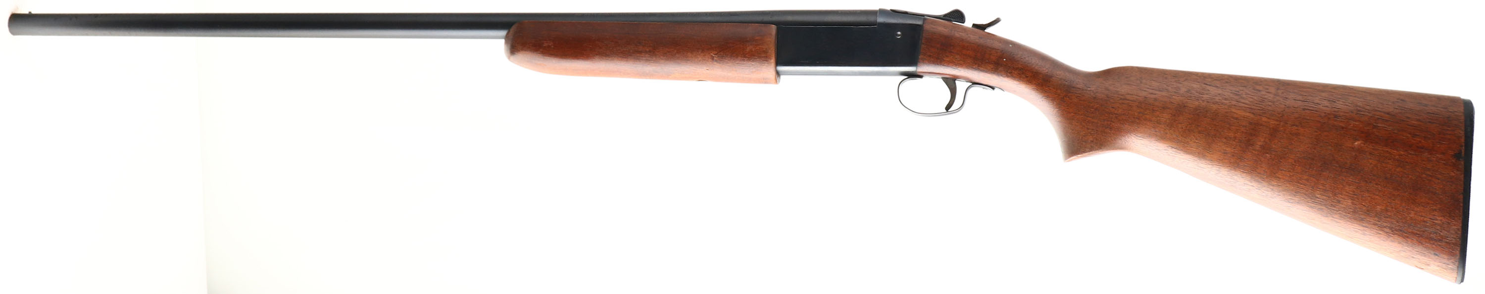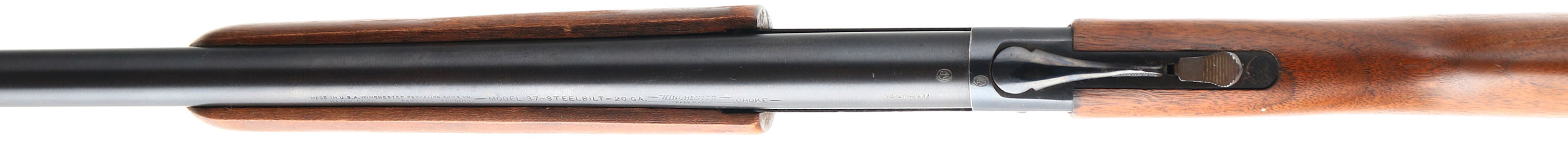Winchester, Model 37, CAL: 20 GA, MFG: 1936-63, SN: None, Break Action Single Shot Shotgun, 2 3/4'', Choke: Full, 28'' barrel. The flat pistol grip wood stock & beavertail forend are excellent. There are contusions, minor scrapes & dings, with thinning or flaking finish at the handling points. The original metal blue finish rates 90% overall. Bore is excellent. The barrel holds a single front bead. Winchester checkered buttplate. FFL Req. - Value: 200 to 400