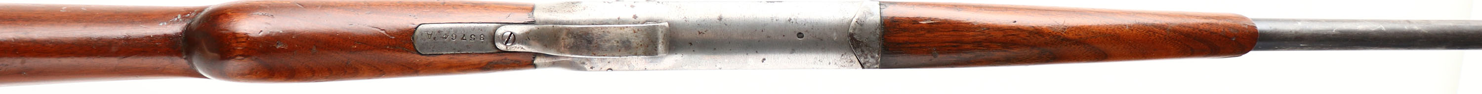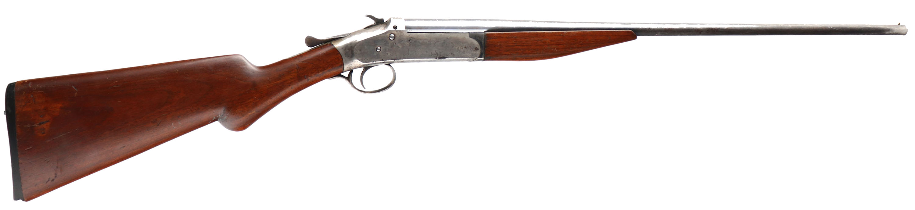 Iver Johnson Arms & Cycle Works Model Champion , CAL: 410 GA, MFG: 1905-08, SN: 85764, Break Action Single Shot Shotgun, 26'' barrel. The pistol grip wood stocks are very good & solid, but there is a small chip at the toe & a 3'' stress crack at the tip of the forend. There are several nicks, scratches & dings to the original finish. The metal blue finish on the barrel rates 40%. The receiver has faded case-coloring, with a few spots of rust pitting & speckling. The receiver is marked ''Iver Johnson Arms & Cycle Works - Fitchburg. MASS. U.S.A.'' & ''Champion'' on the left side. Bore is excellent. Single front bead. Buttstock carries a owl's head black plastic buttplate, with a 1/2'' chip at toe. LOP: 14''. FFL or C&R Req. - Value: 150 to 300